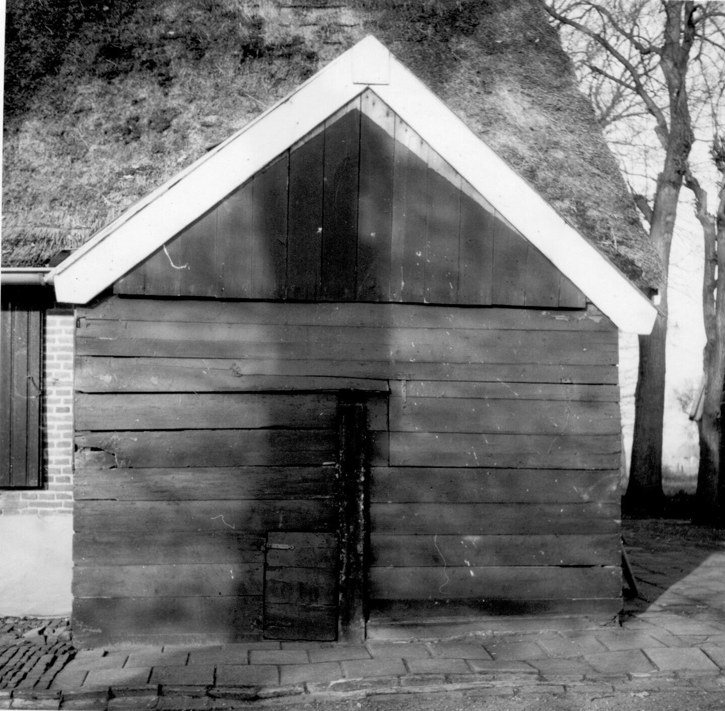 Een houten uitbouw met daarin een hondenkarn, tegen de zijmuur van een boerderij aan de Hexelseweg in Wierden.