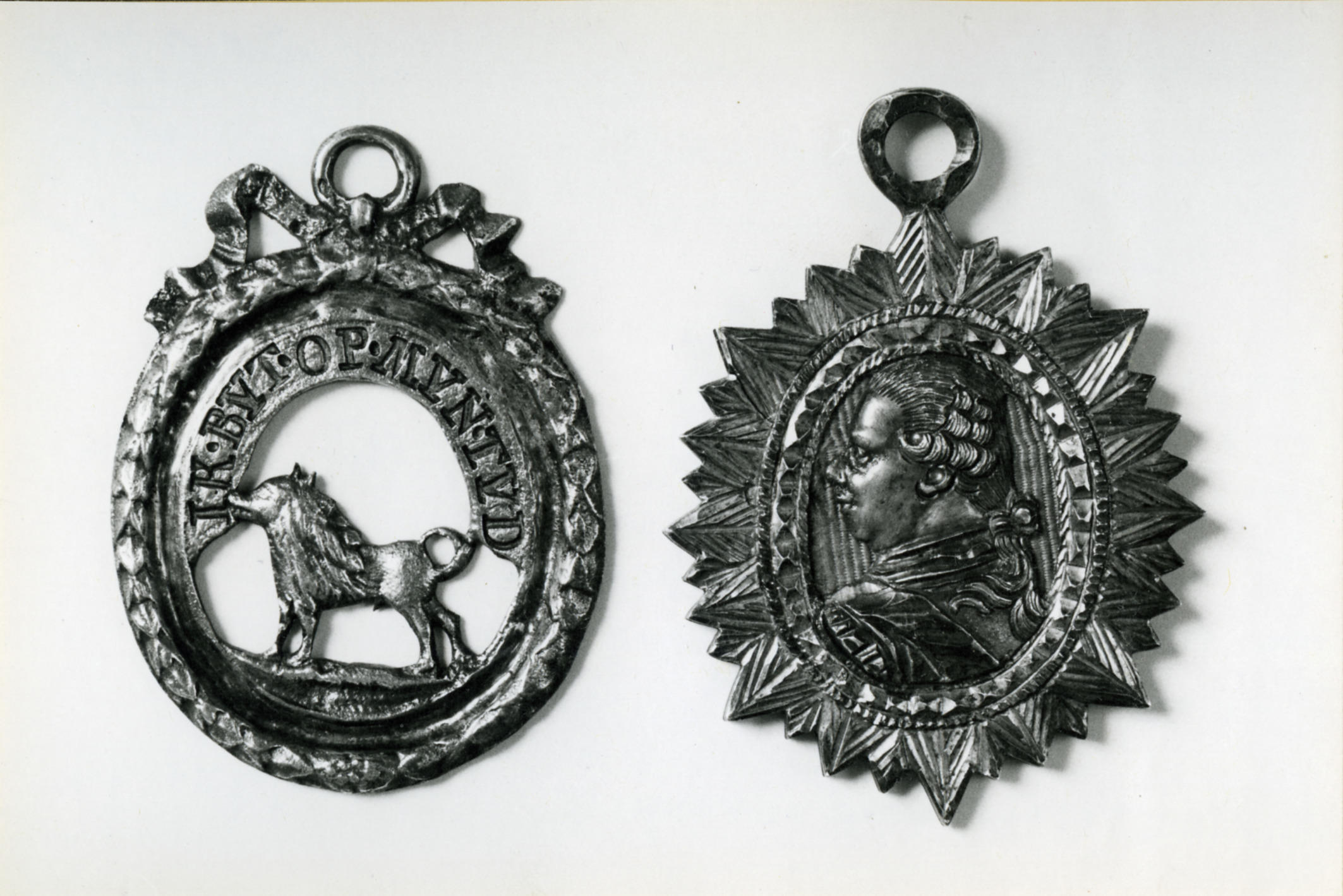 Foto van twee draagpenningen uit de collectie van het Koninklijk Kabinet van munten, penningen en gesneden stenen in 's-Gravenhage. Links is een patriotse penning met een keeshond te zien, rechts een orangistische penning met de beeltenis van Willem V.