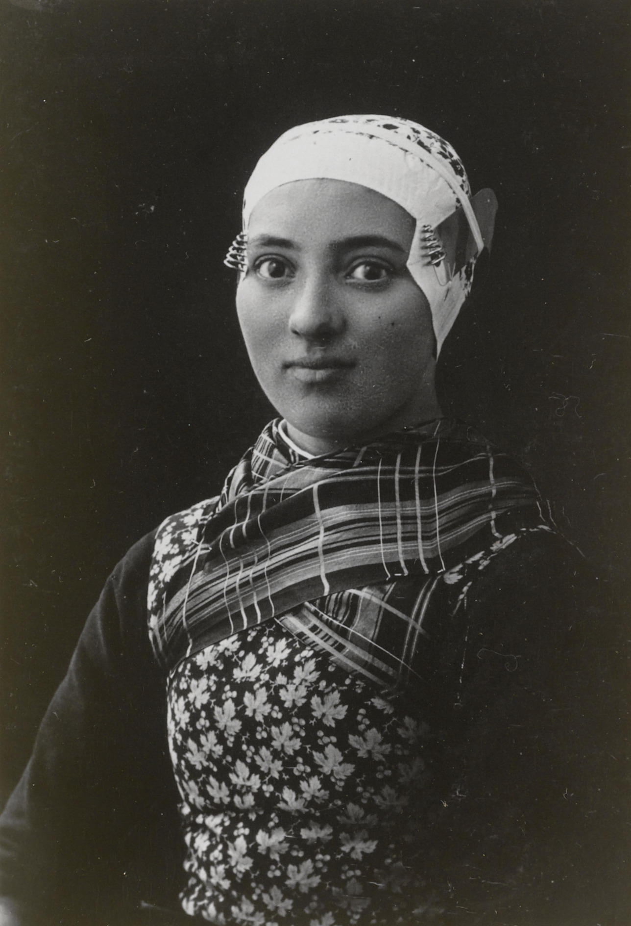 Vrouw uit Hierden in Veluwse dracht, circa 1900 (zwart-wit foto)