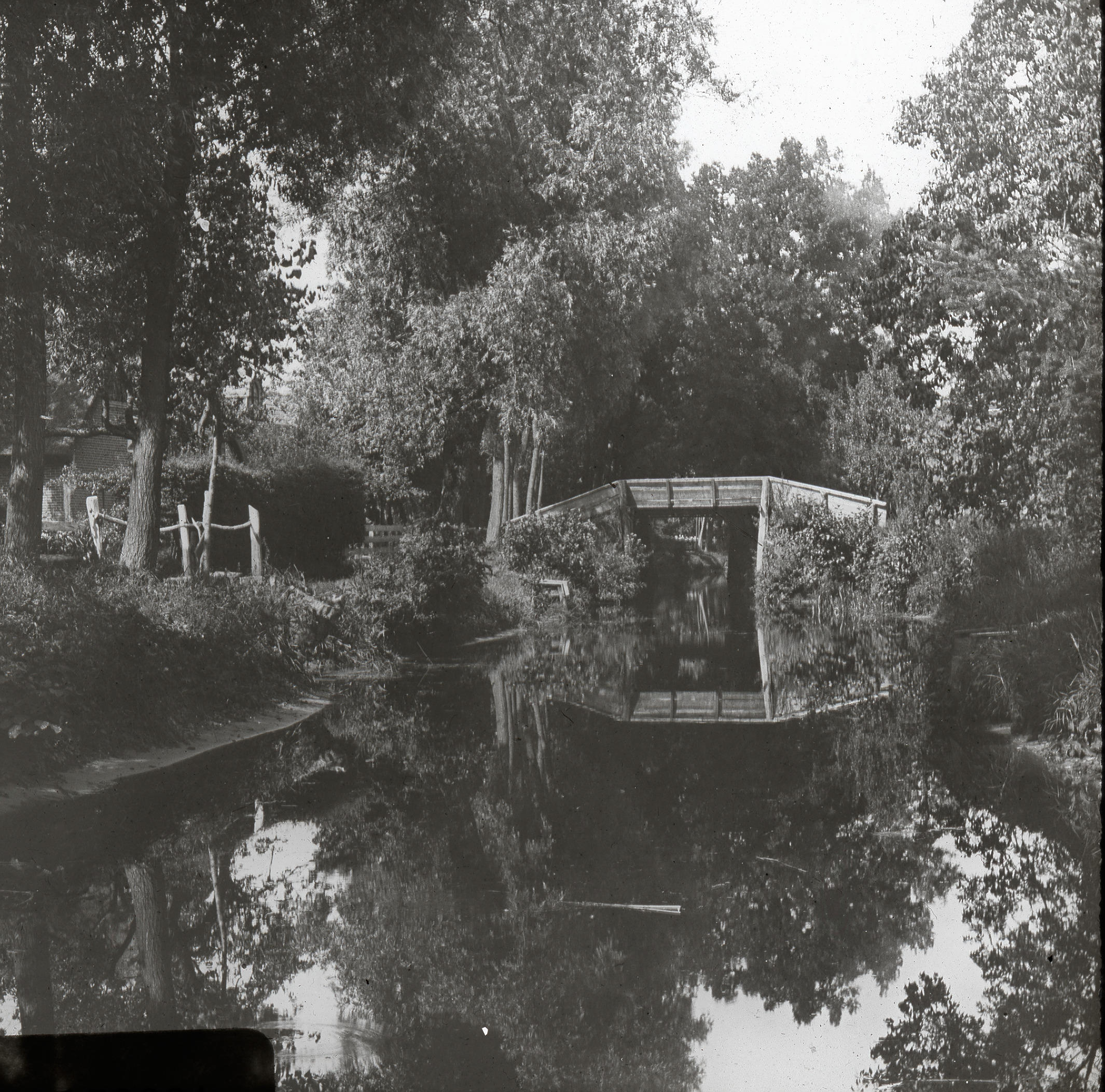 Dorpsgezicht in Giethoorn. Links is de leuning van een 'vonder' (bruggetje) te zien en op de achtergrond staat een brug. De opname is waarschijnlijk gemaakt omstreeks 1900.