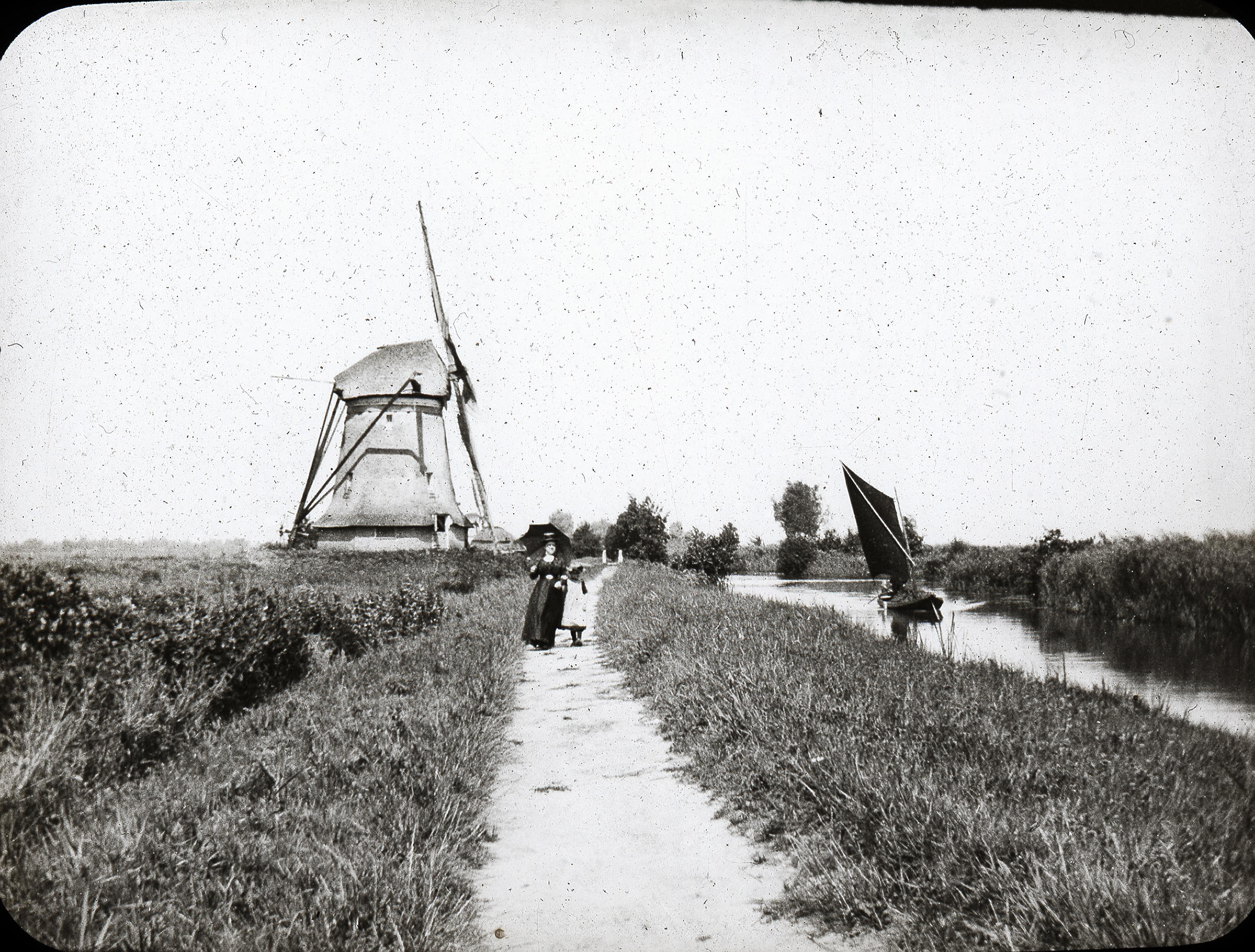 Windmolen in Giethoorn. Op het pad wandelen een vrouw en meisje in modedracht. Rechts is een zeilende punter te zien. De opname is waarschijnlijk gemaakt omstreeks 1900.