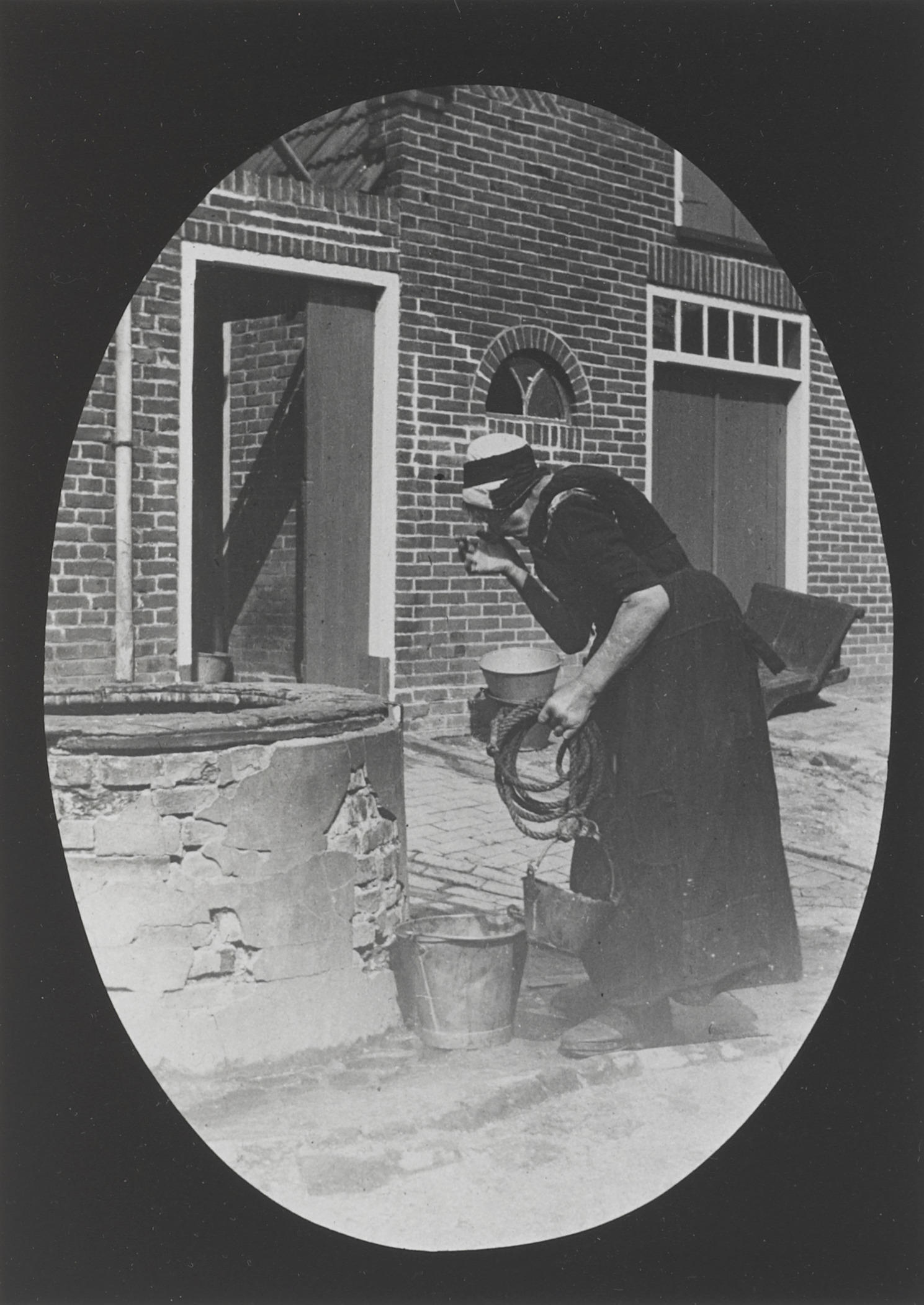 Vrouw in Urker dracht bij een put, vermoedelijk circa 1900 (zwart-wit dia)