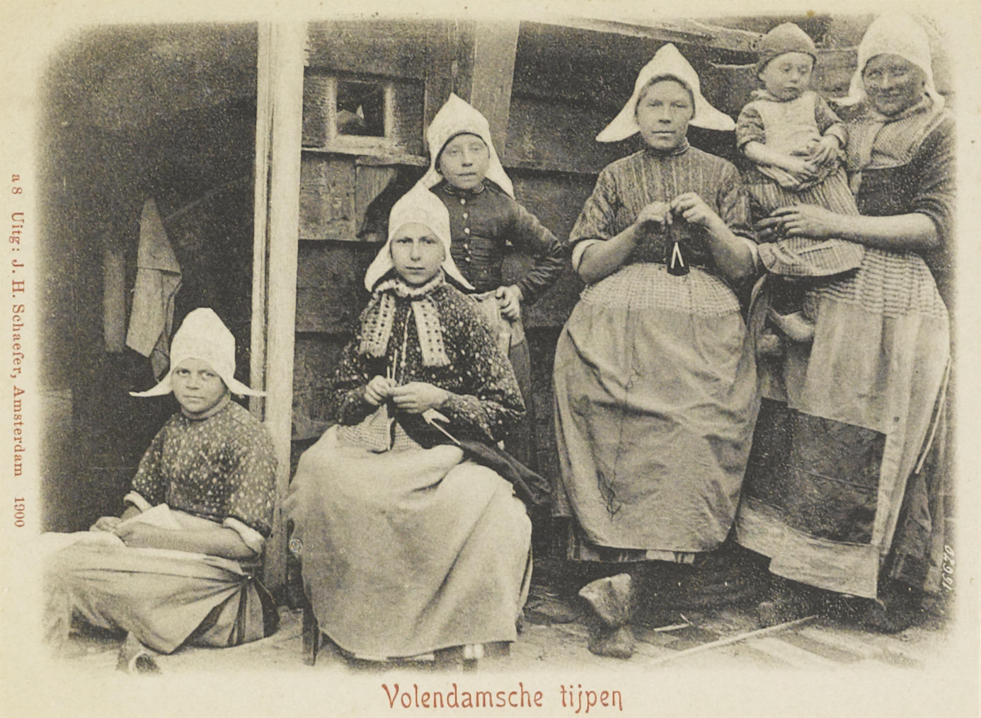 Vrouwen en meisjes in Volendammer streekdracht, circa 1900 (ansichtkaart)