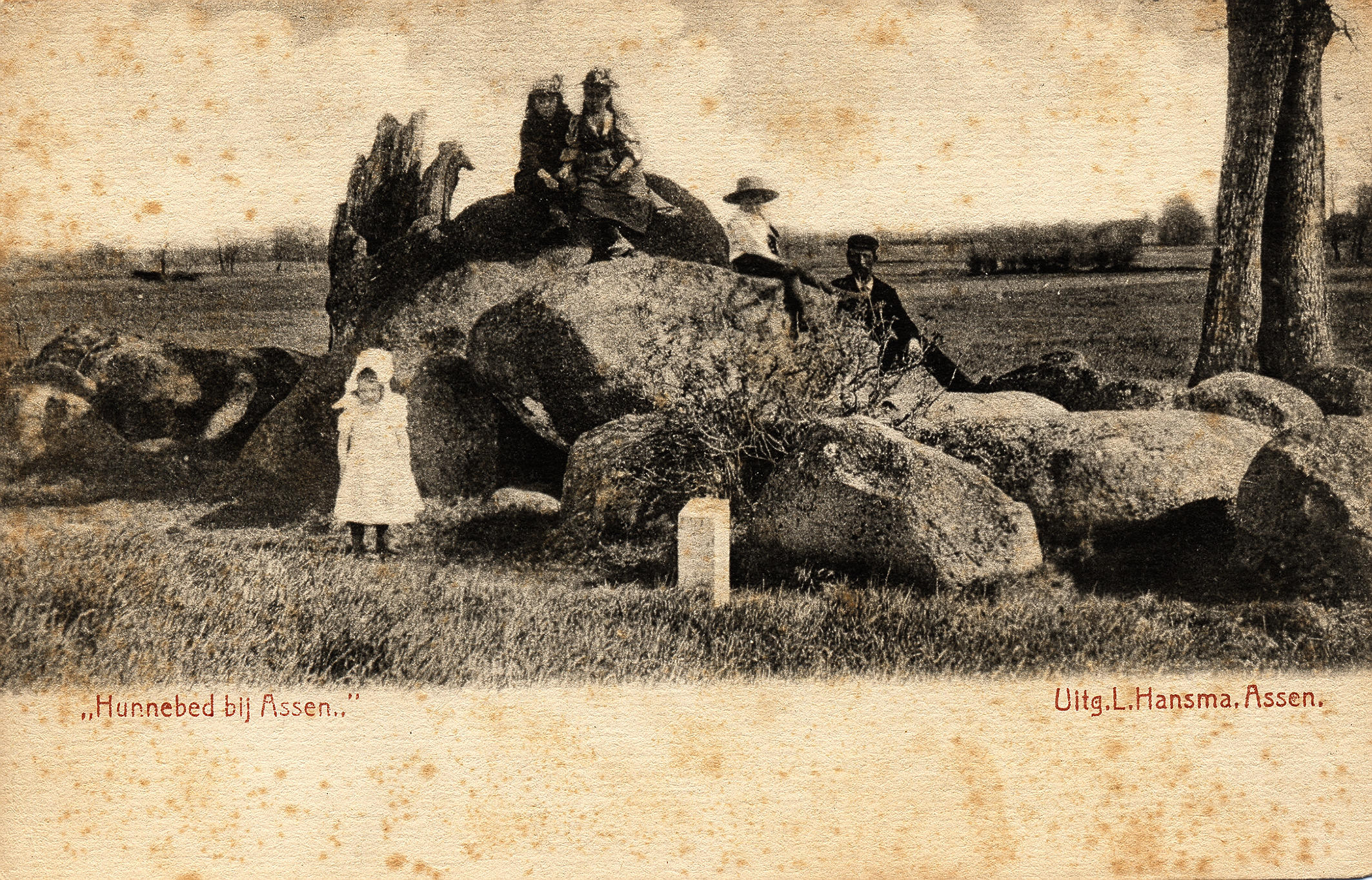 Ansichtkaart met een afbeelding van een hunebed bij Assen.