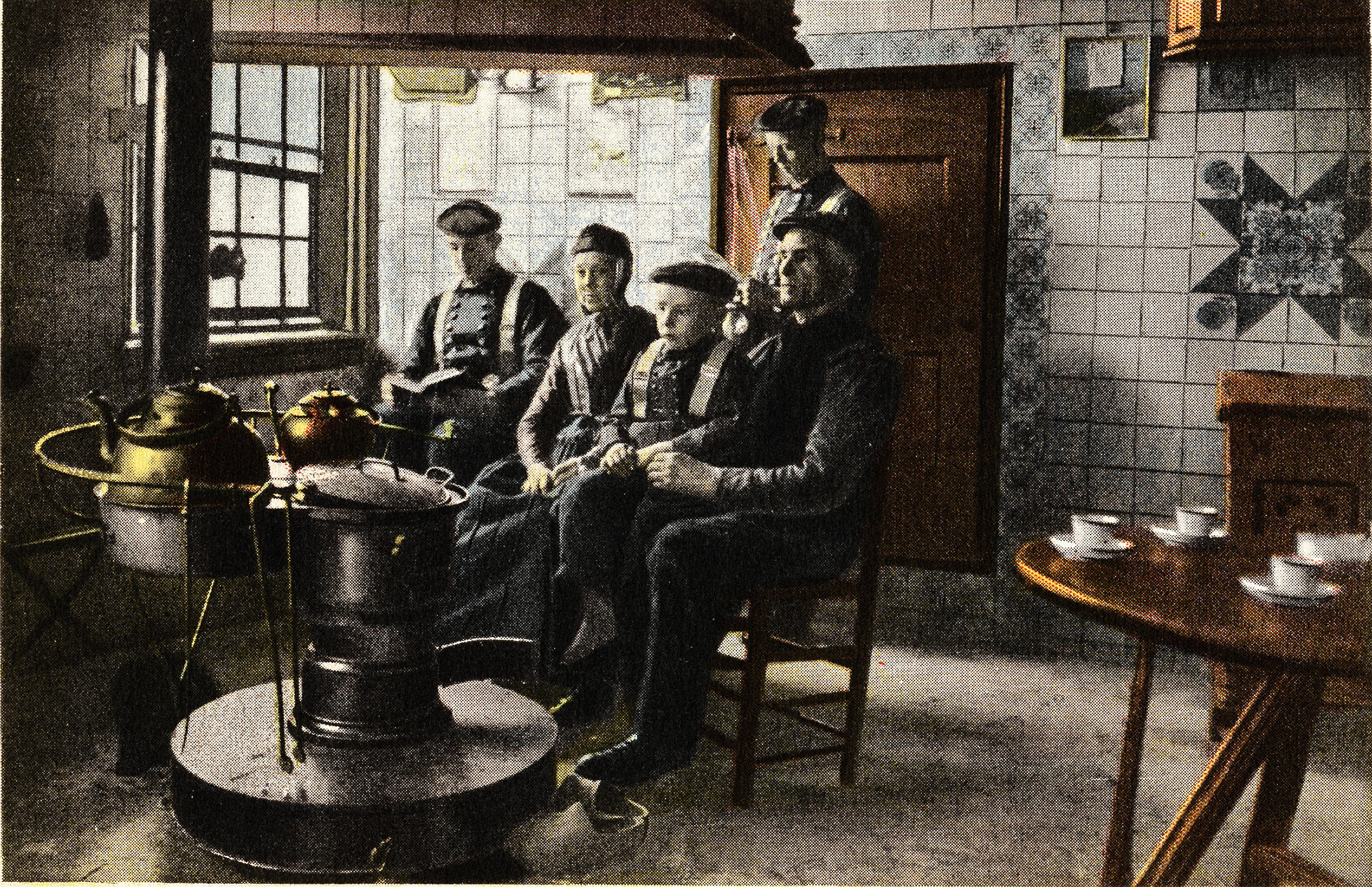 Interieur met de familie Stegeman, gekleed in Staphorster streekdracht, gezeten rond de kachel. Rechts zit vader Harm Stegeman met links van hem zijn vrouw Jentje Stegeman-Mussche. Bij het raam zit Peter Stegeman en achteraan staat Klaas Stegeman. De naam van de jongen die bij Harm op schoot zit is onbekend.
