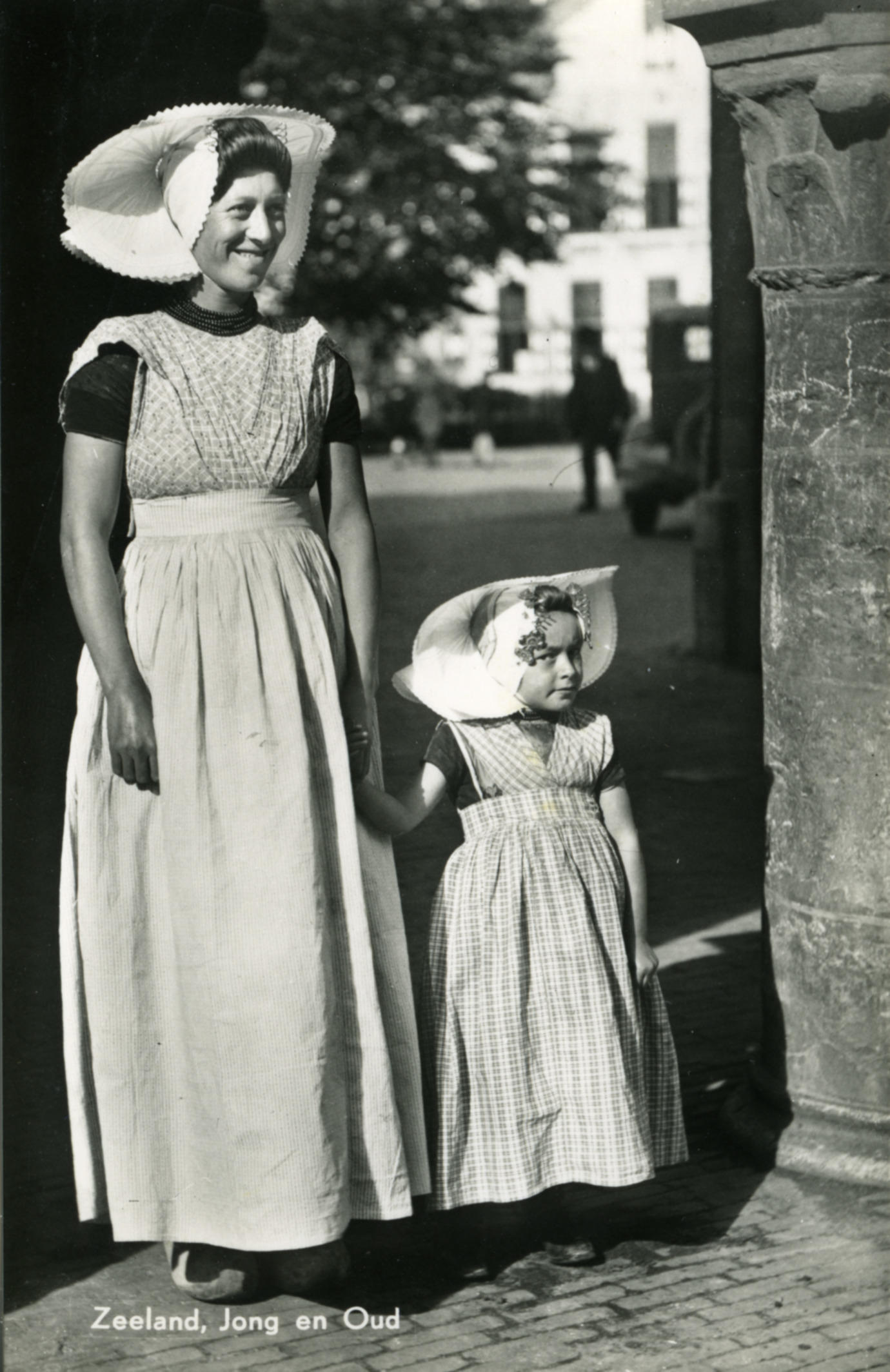 Jannetje Caljouw-Schets en haar nichtje Sien Caljouw in streekdracht uit Arnemuiden. Sien draagt buitenproportionele sieraden. Het tooien met deze sieraden werd gedaan bij meisjes die men tegen betaling door toeristen liet fotograferen op de markt in Middelburg. Inwoners van Arnemuiden probeerden zo iets bij te verdienen. Dit gebruik noemde men wel 'op monnie gaan' (monnie=money). ...