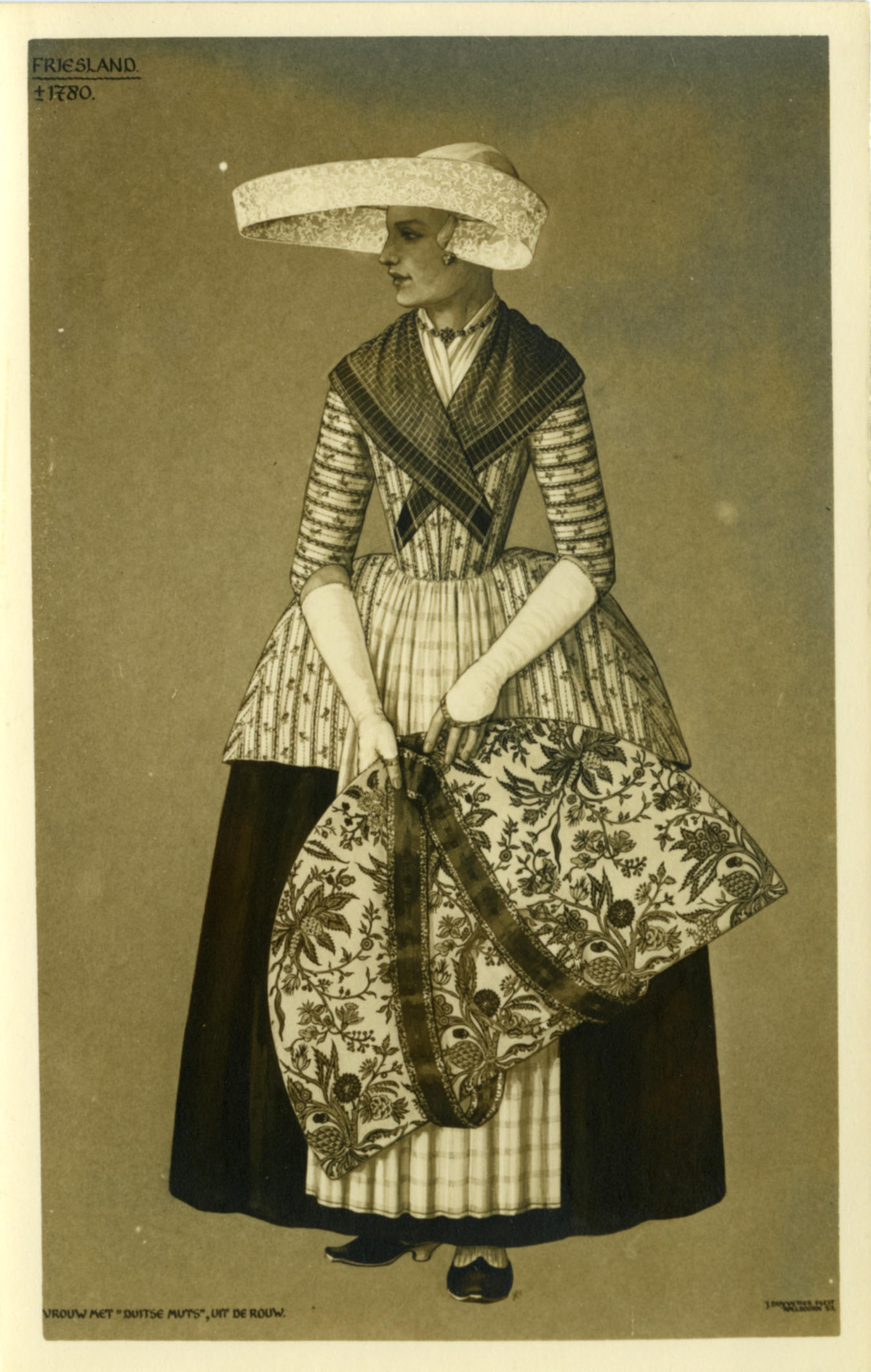 Vrouw in Fries kostuum rond 1780. Ze draagt een zogenoemde Duitse muts.