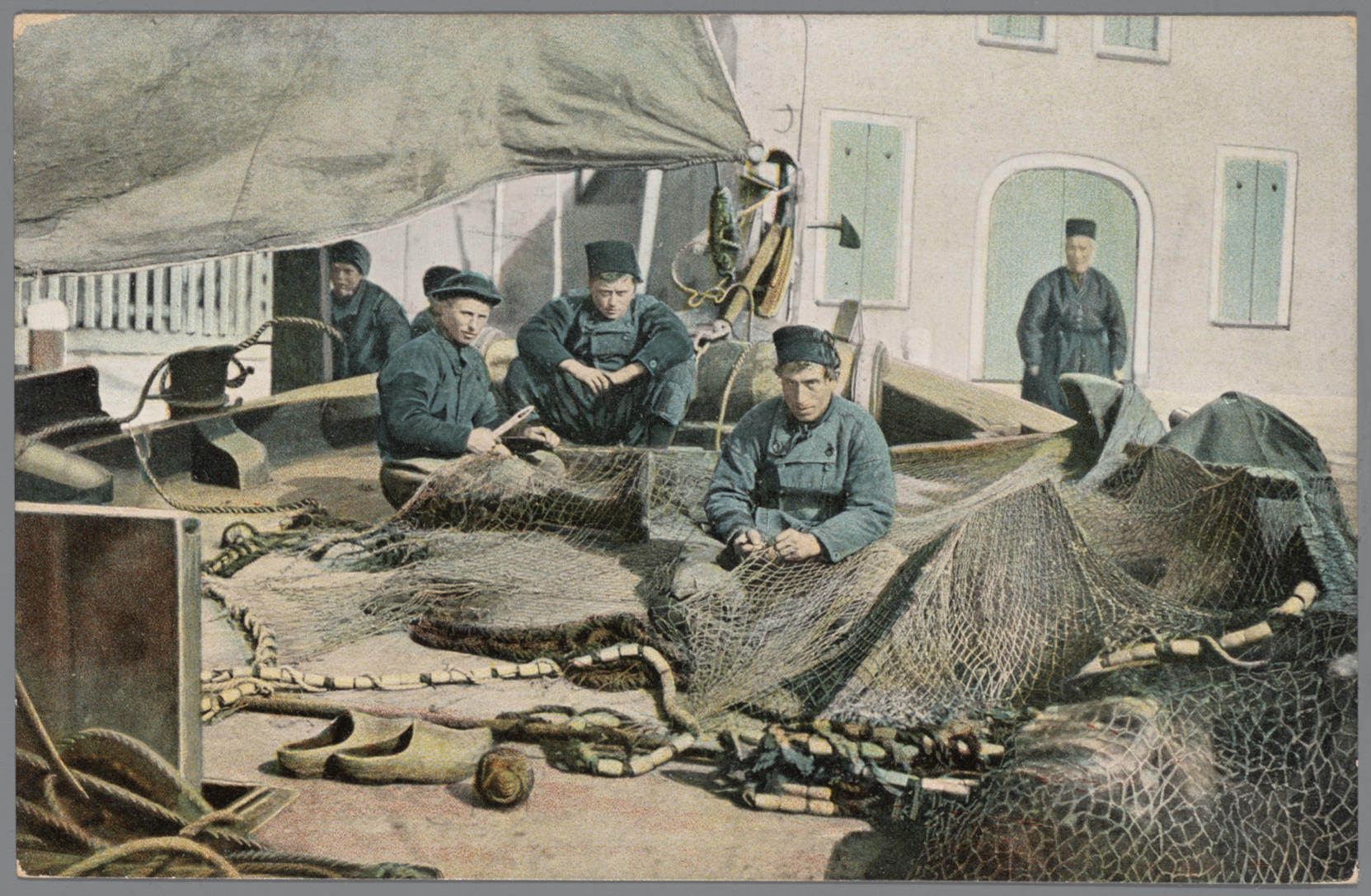 Mannen in Urker streekdracht aan het netten boeten aan boord van een schip.