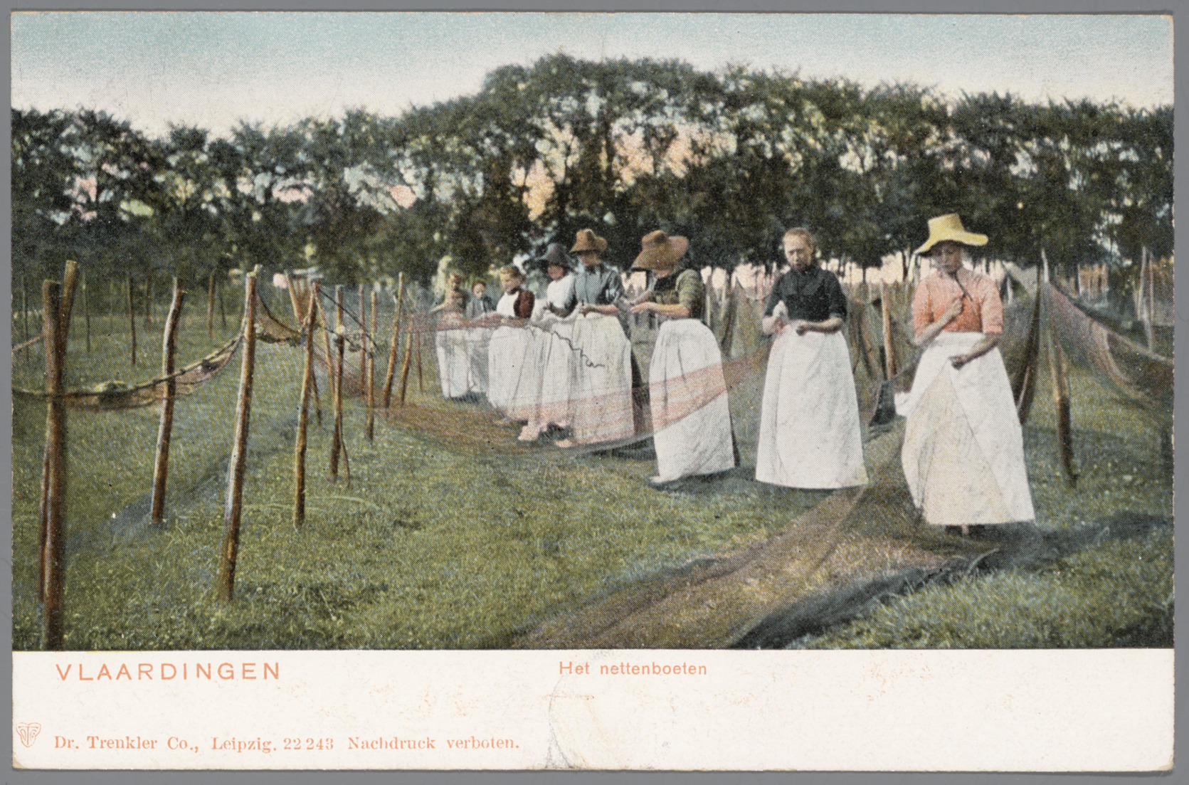 Vrouwen in Vlaardingse dracht aan het nettenboeten (ansichtkaart)