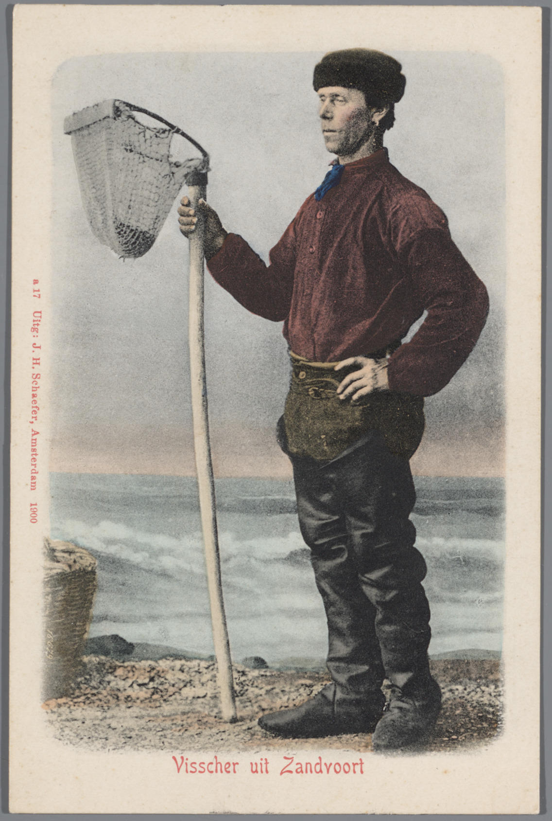 Schelpenvisser in Zandvoortse streekdracht met schepnet. Over zijn broek draagt hij lieslaarzen.
