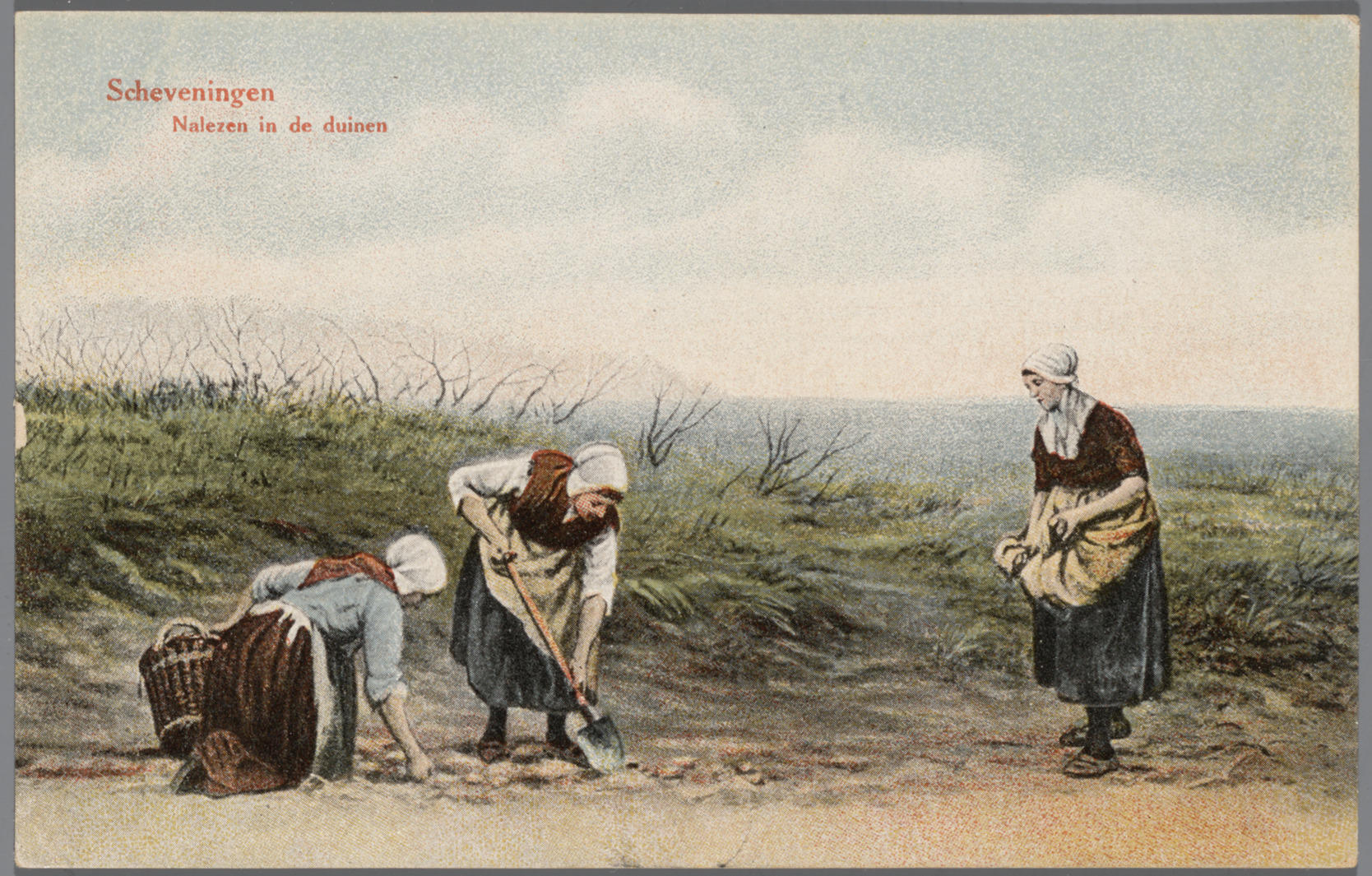 Drie vrouwen in Scheveningse streekdracht, aan het werk op een akker in de duinen.