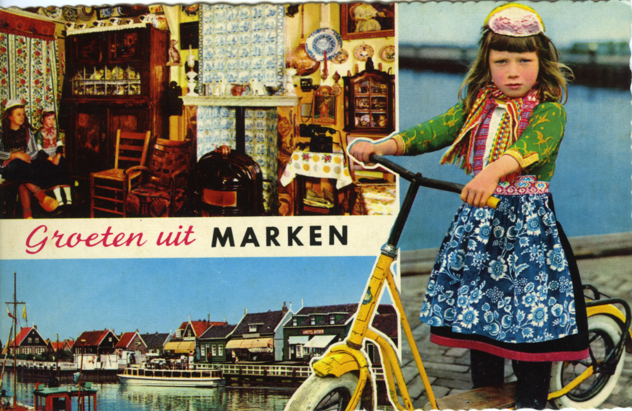 Linksboven een vrouw en een meisje in Marker streekdracht, gefotografeerd in een traditioneel Marker interieur. Linksonder de haven van Marken. Recht een jongen in Marker streekdracht met een step. Hij is gekleed in rokkendracht.