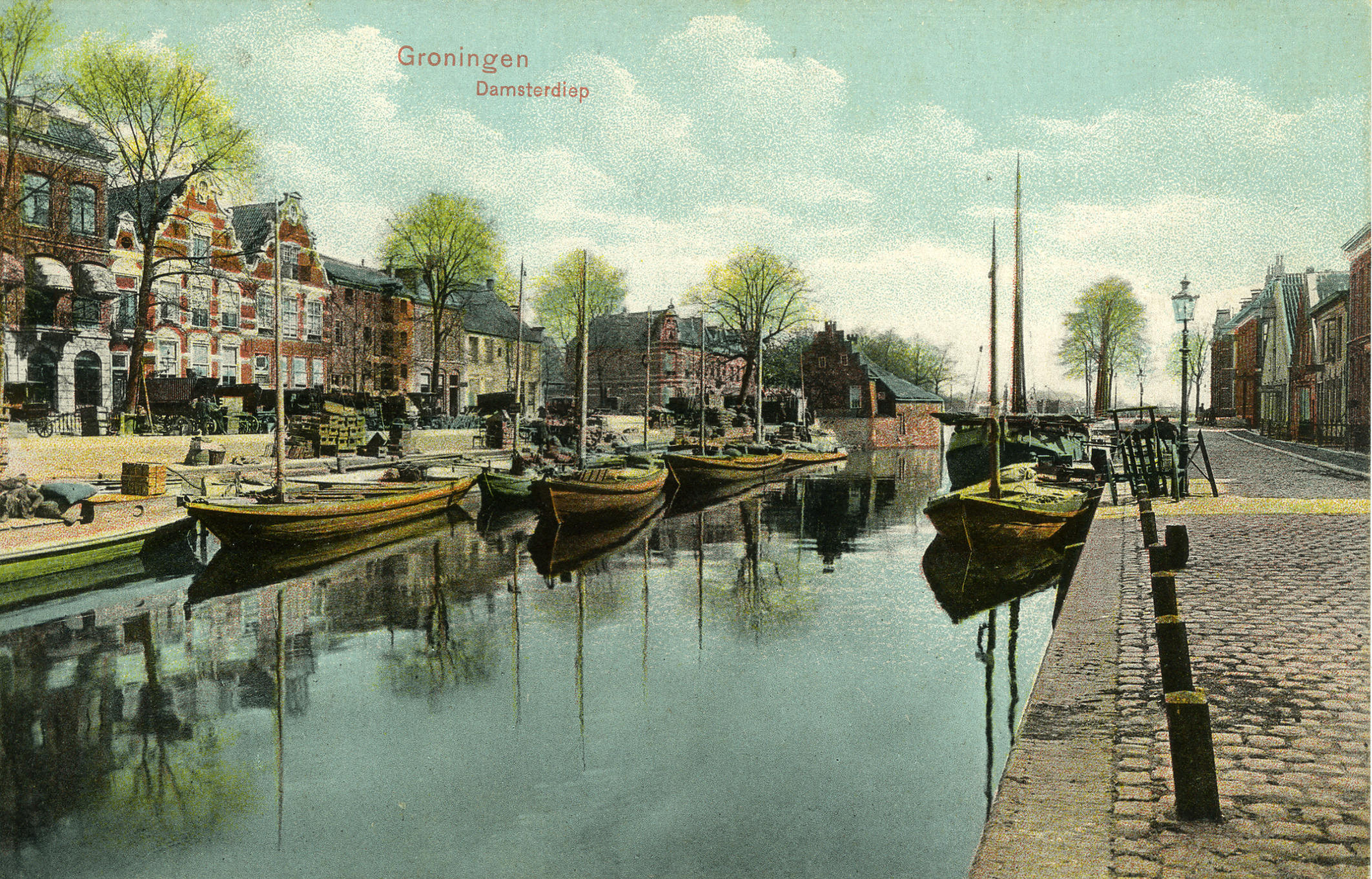 Ingekleurde ansichtkaart met een stadsgezicht in Groningen. Schepen liggen aangemeerd in het Damsterdiep.