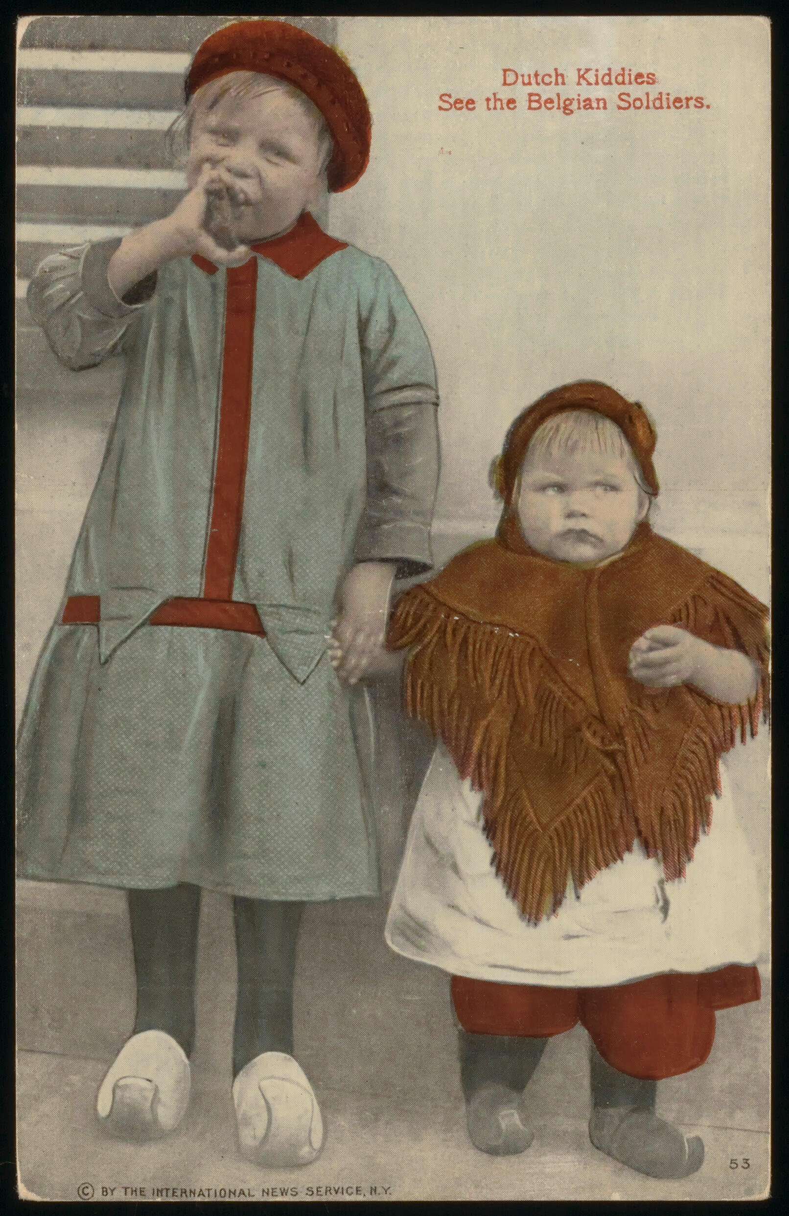 Ingekleurde ansichtkaart van twee meisjes. Op de voorzijde van de kaart staat de tekst: 'Dutch Kiddies See the Belgian Soldiers'. Volgens een opschrift op de achterzijde zijn deze kinderen gefotografeerd bij het Belgenkamp bij Harderwijk. Hier zaten tijdens de Eerste Wereldoorlog Belgische soldaten geïnterneerd. De meisjes dragen algemene modekleding en lopen op klompen.