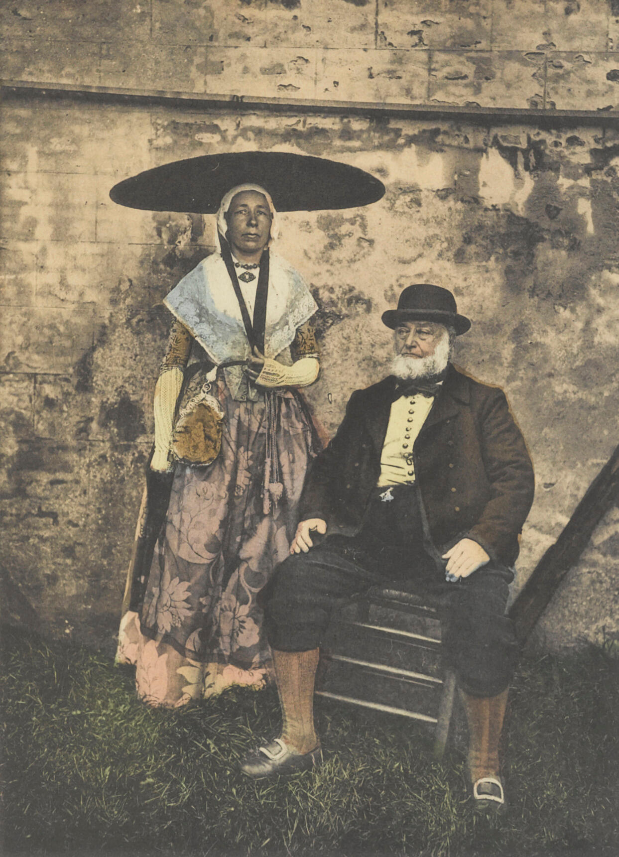 Vrouw en man, verkleed in Friese dracht, circa 1900 (ansichtkaart)