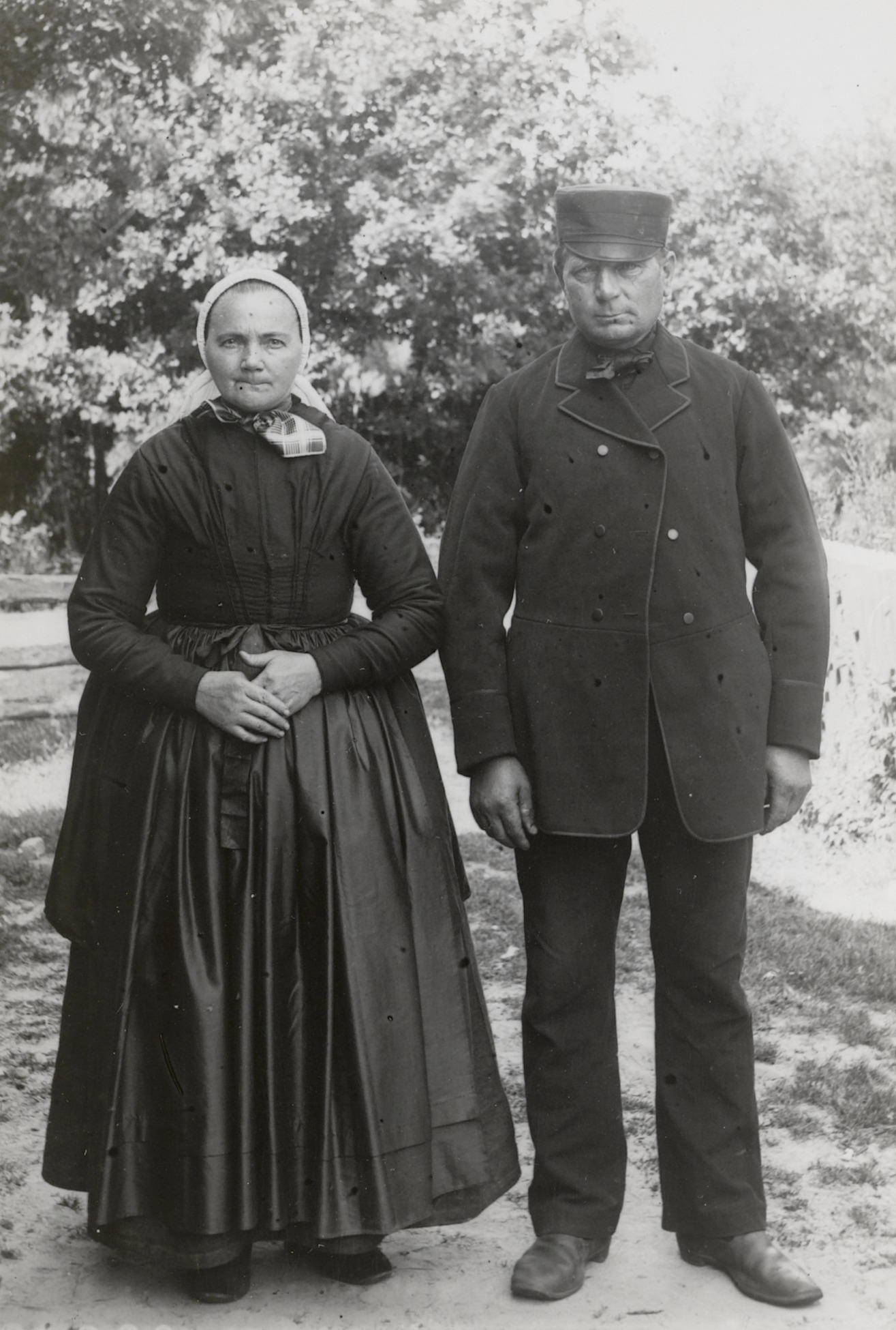 Bertha Gortermaker en Jan Hendrik Kemper in zondagse dracht, Den Ham, 1899 (zwart-wit foto)