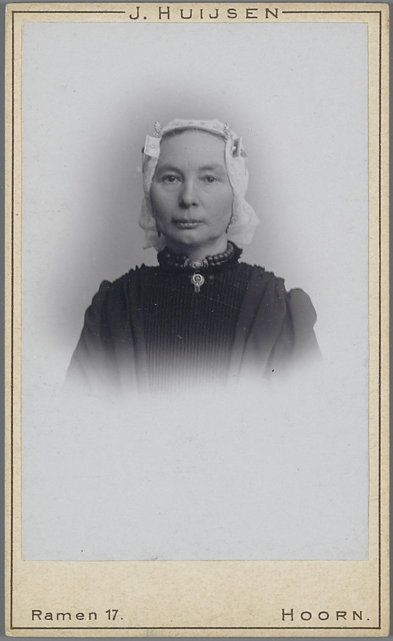 Vrouw in West-Friese streekdracht. De vrouw draagt onder haar kanten muts een oorijzer waarvan de 'boeken' (rechthoekige oorijzer-uiteinden) ter hoogte van het voorhoofd zichtbaar zijn. Boven deze boeken zijn twee mutsspelden in de muts gestoken. De vrouw draagt een halssnoer met twee strengen kralen aan een driedelige sluiting.