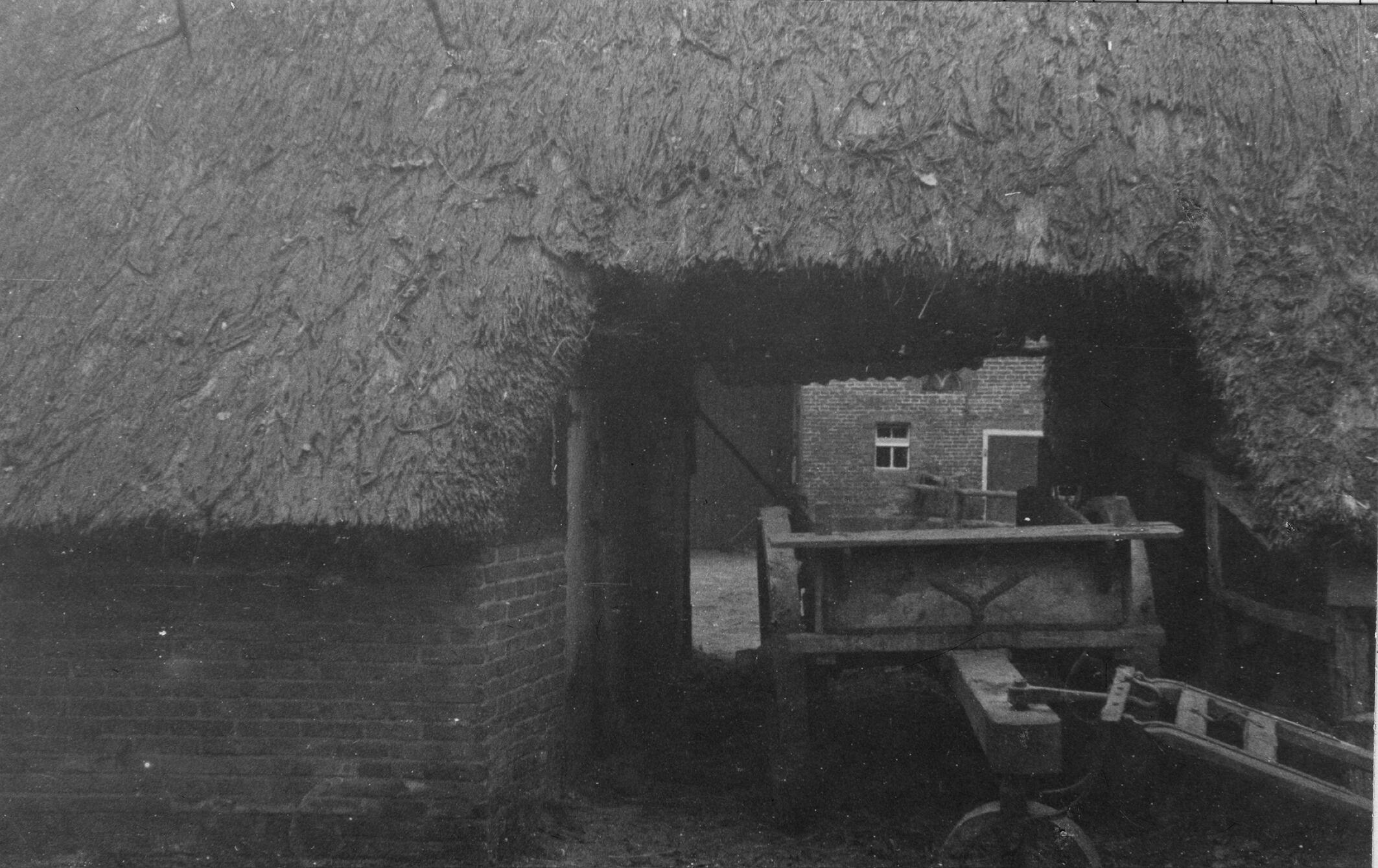 Doorgang in de muur van een boerderij in het Overijsselse Hoge Hexel. In de doorgang staat een boerenwagen.
