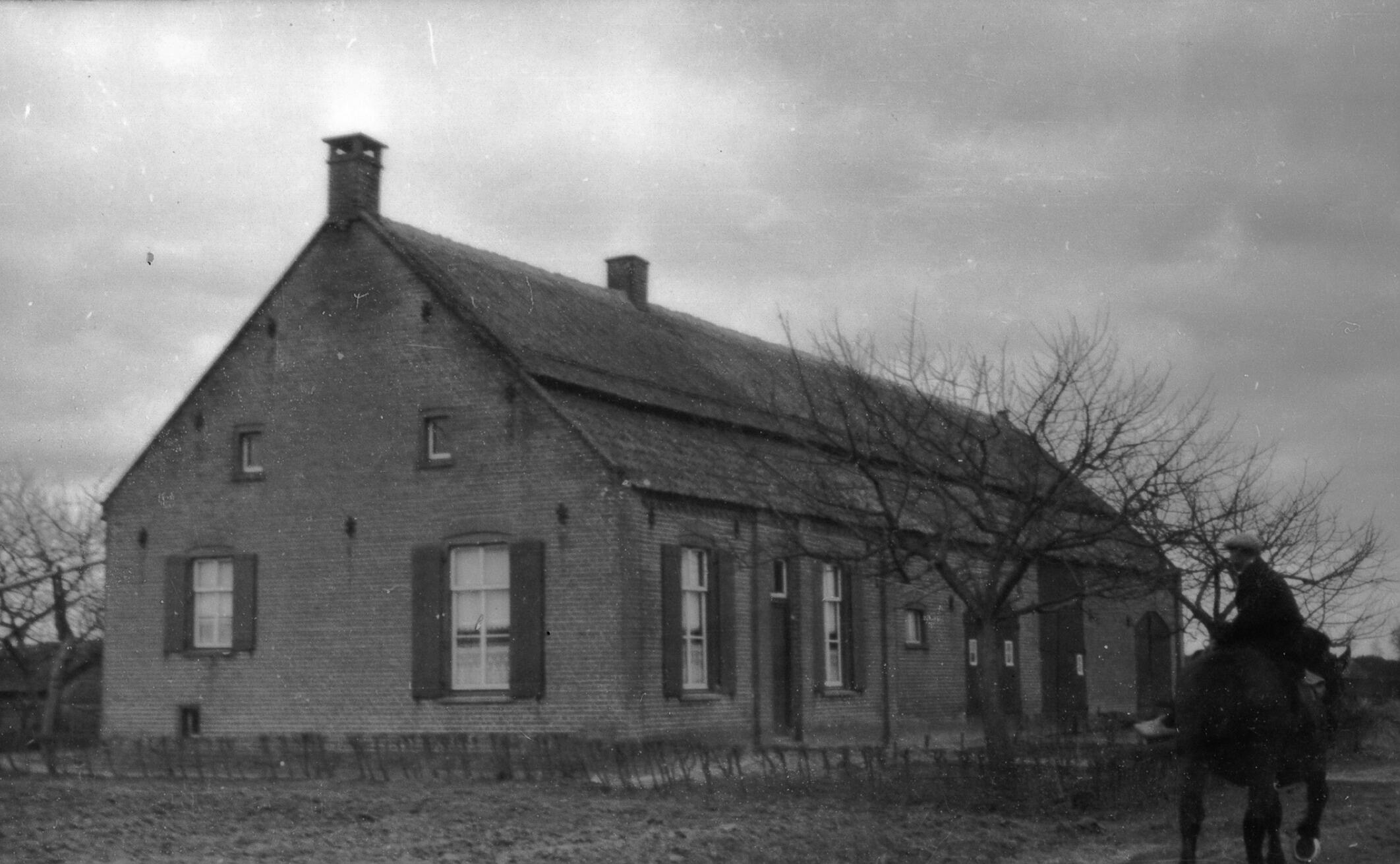 Een langgevelboerderij in het Brabantse Vloeieind. Voor de boerderij loopt een paard met daarop een ruiter.