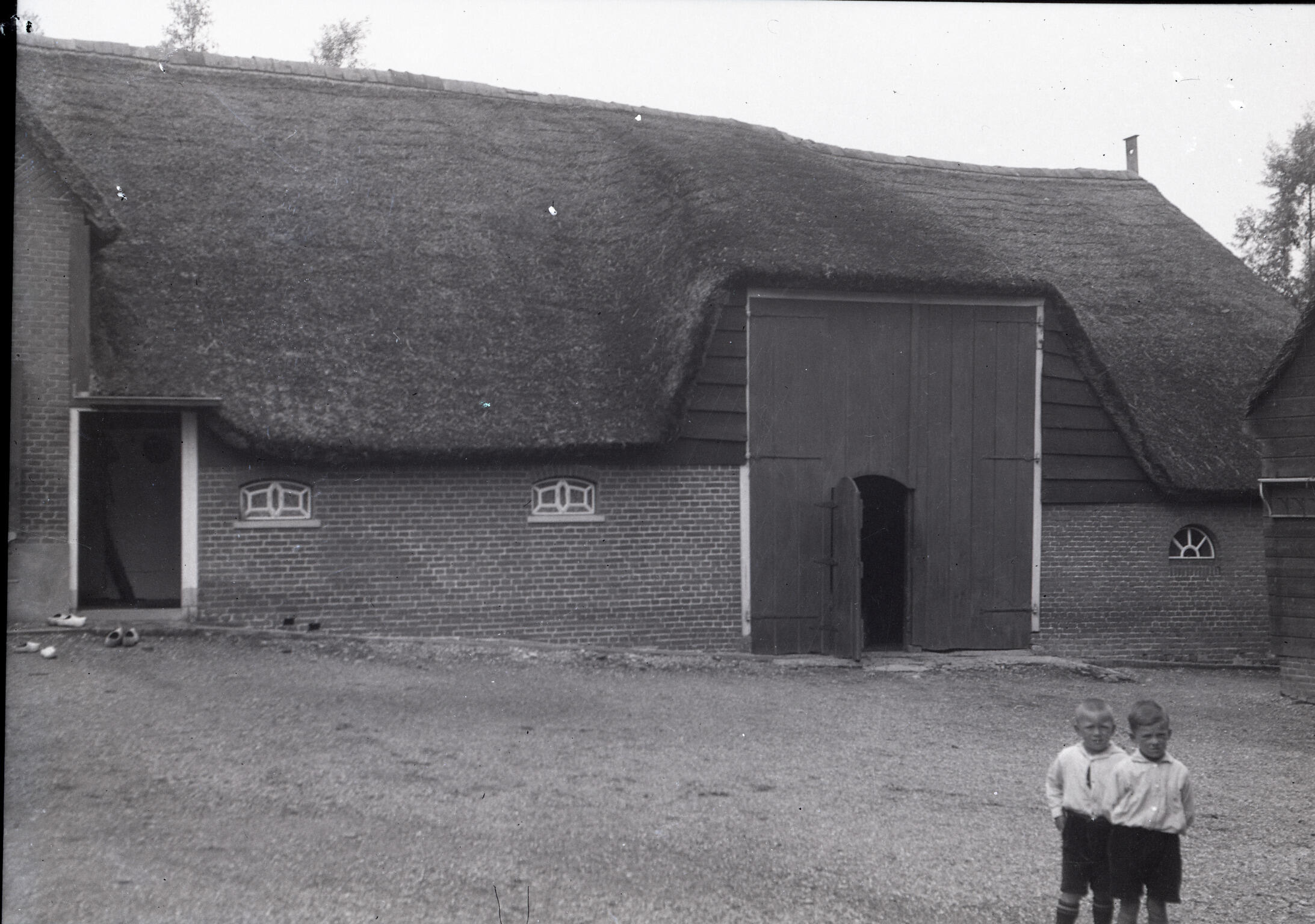 Zijgevel van een boerderij met een zijbaander in het Zuid-Hollandse Peursum. Naast de boerderij staan twee jongens.