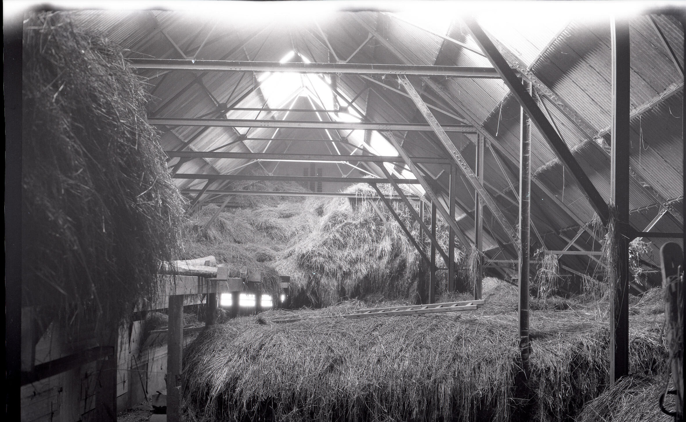 Interieur van een landbouwschuur, Dinteloord, 1937 (zwart-wit foto)