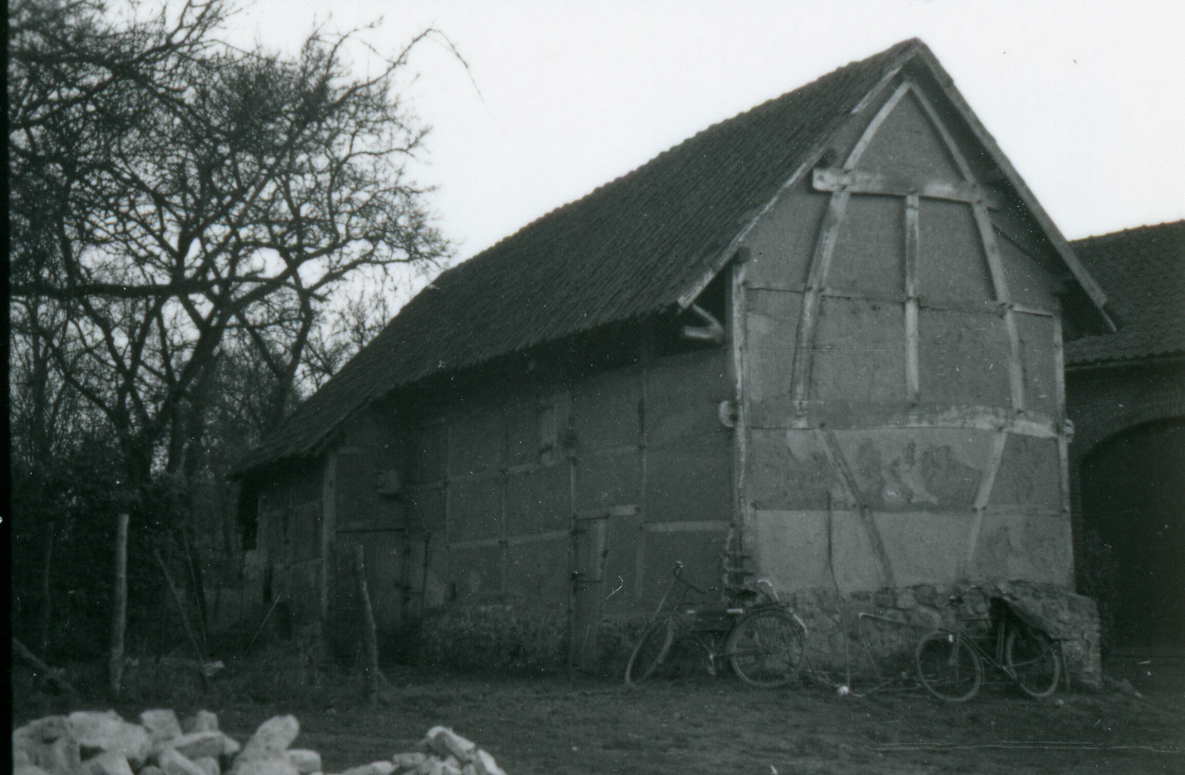 Schuur met vakwerkbouw, Bruisterbosch, 1937 (zwart-wit foto)