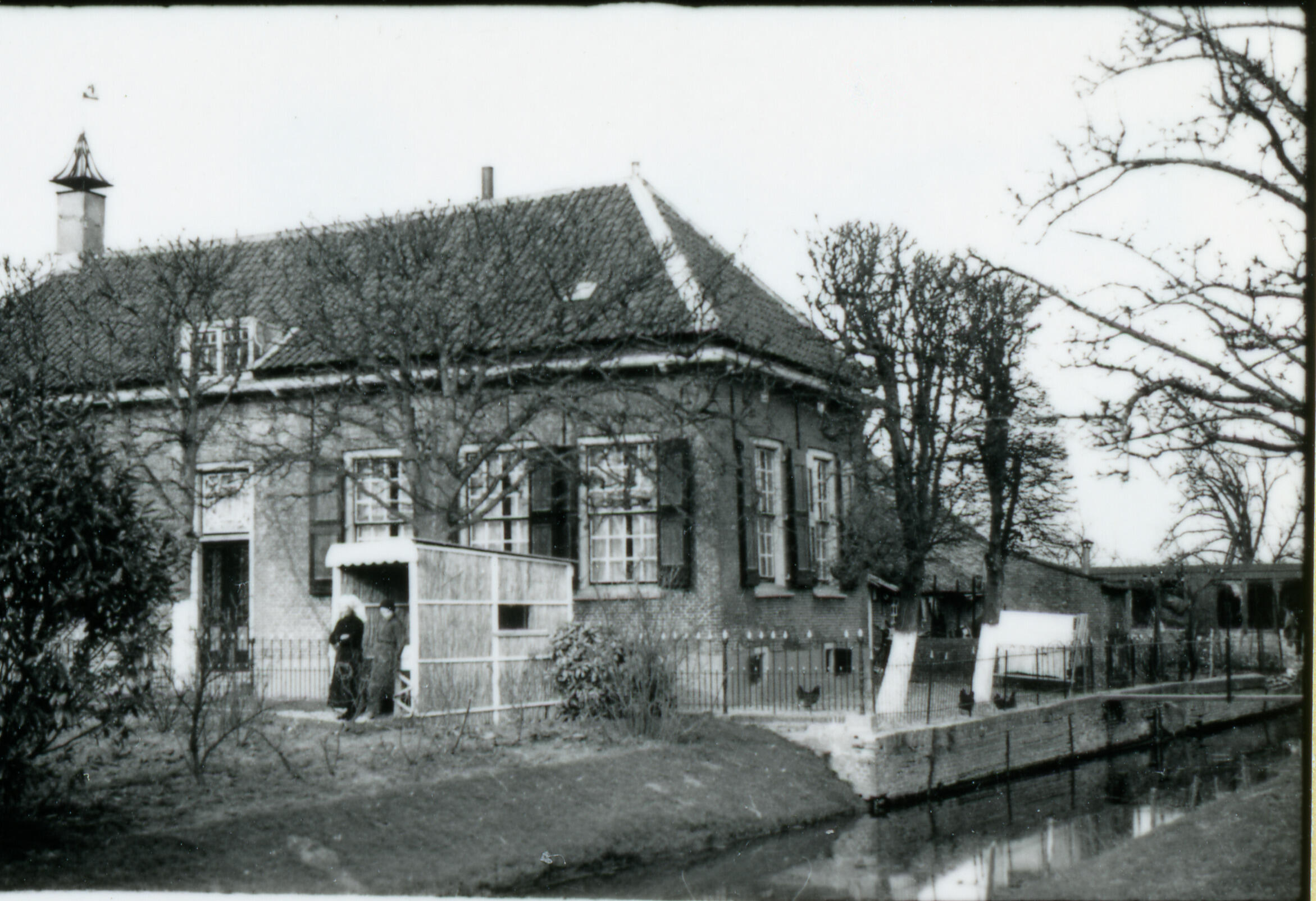 Voor- en zijgevel van een Zuid-Hollandse boerderij met een dwarshuis, gelegen aan het water. Voor de boerderij staan een vrouw en man onder een afdak. Rondom de boerderij staan bomen met witgekalkte stammen.