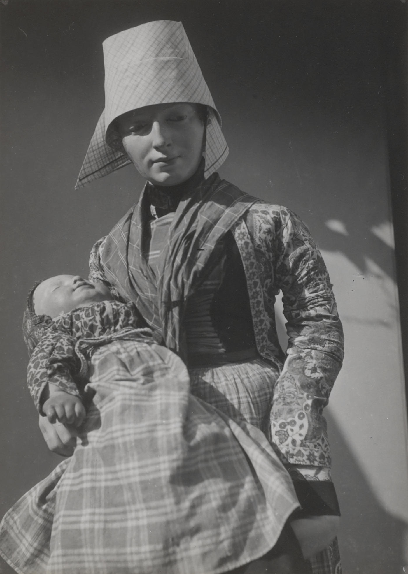 Twee poppen in Hindelooper streekdracht, gefotografeerd tijdens de ontruiming van de streekdrachttentoonstelling in het Nederlands Openluchtmuseum vanwege de evacuatie van de museumcollectie in 1943. Deze Hindelooper drachten maakten geen deel uit van de oorspronkelijke 1898-collectie.