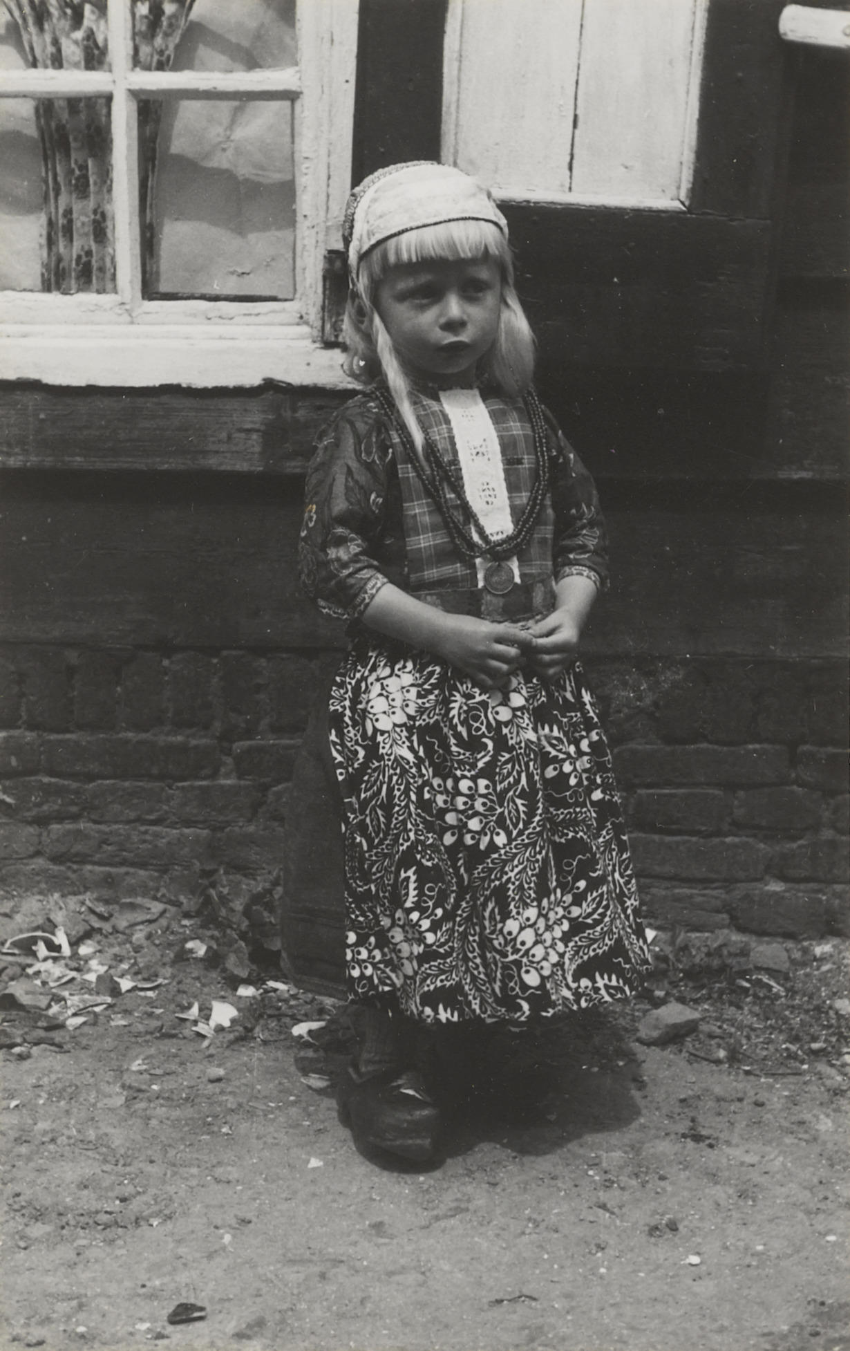 Jan van Brederode in Marker streekdracht. Hij is nog geen 5 jaar oud en draagt de rokkendracht. Jan is als jongen onder meer herkenbaar aan zijn gebloemde 'boezel' (schort) en zijn geruite borstlap met 'legger' (witte strook in de borstlap). Hij is gekleed in pinksterdracht. Om zijn hals draagt hij een penning aan een kralenketting, ...