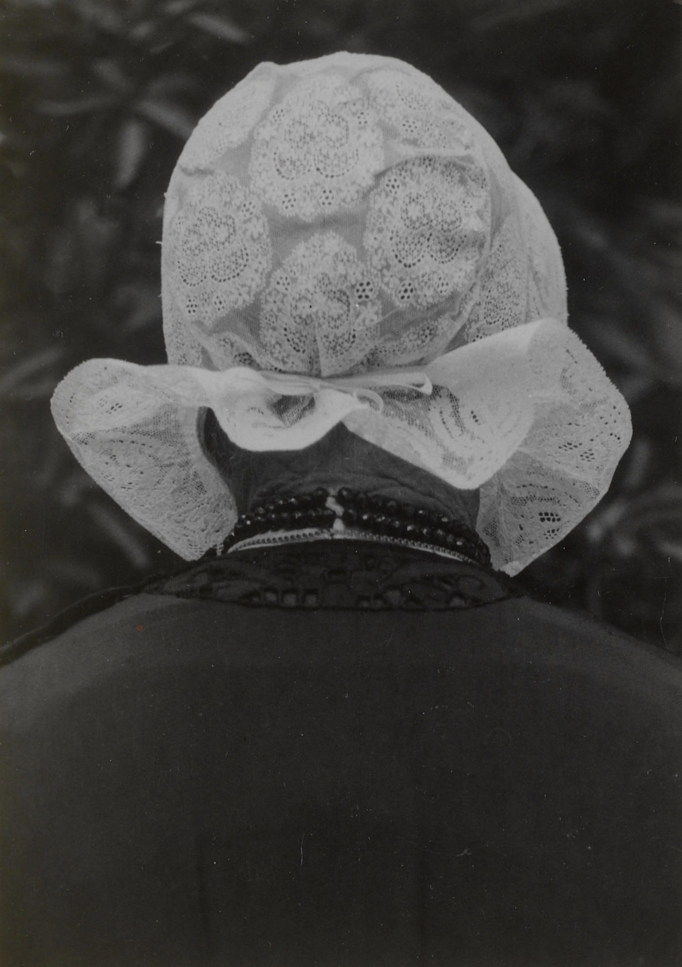 Mevrouw De Bruijne in Cadzandse streekdracht, op bezoek in het Nederlands Openluchtmuseum. Op haar hoofd draagt ze een kornetmuts met een bol van geborduurde tule en een voor- en achterstrook van Rijselse kloskant.
