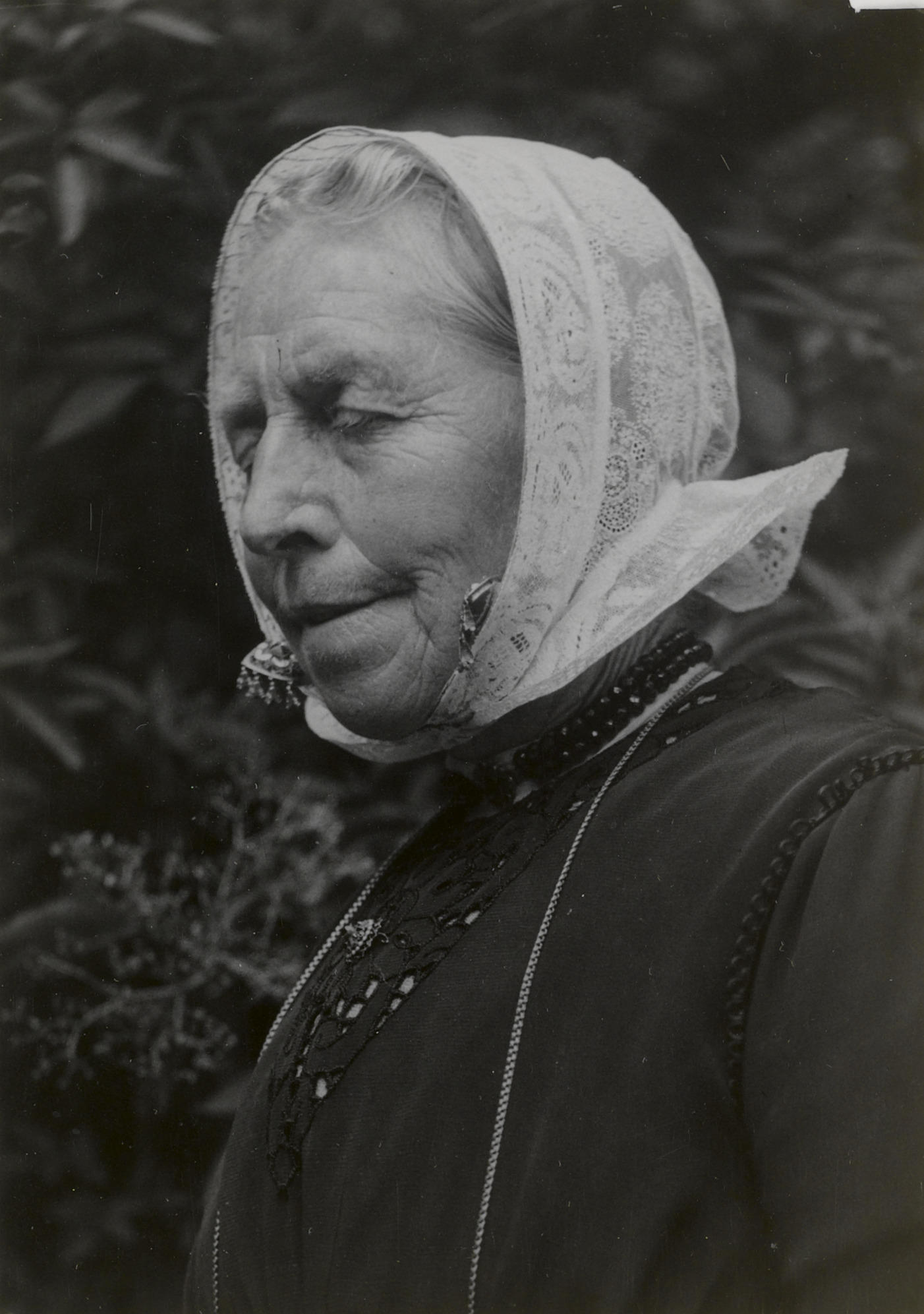 Mevrouw De Bruijne in Cadzandse streekdracht, op bezoek in het Nederlands Openluchtmuseum. Ze draagt een jak en een rok met een schort. Op haar hoofd heeft ze een kornetmuts met mutsenbellen in de voorstrook. De bol van de muts is van geborduurde tule en de voor- en achterstrook zijn van Rijselse kloskant.