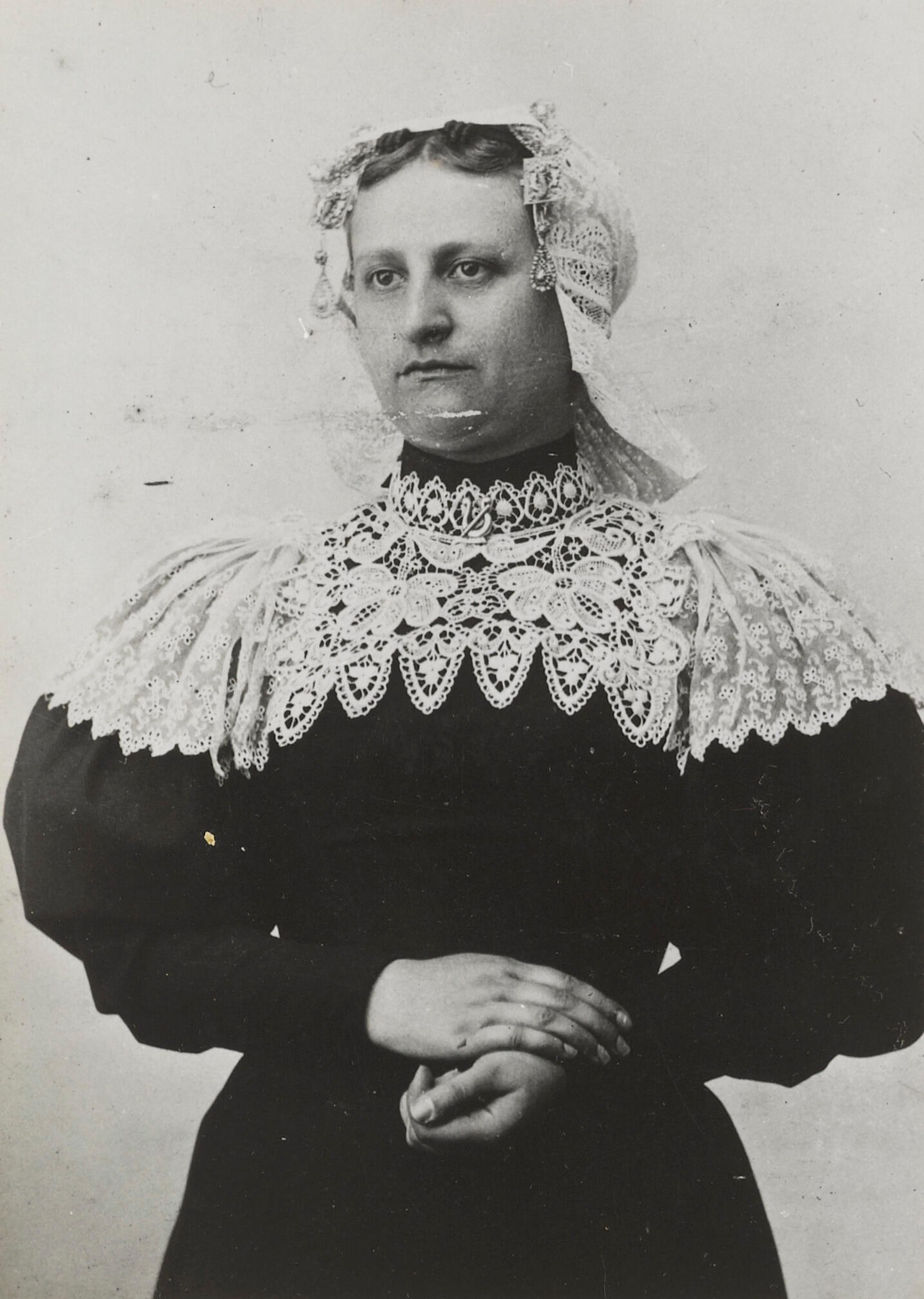 Vrouw uit Rijnsburg in Rijnlandse streekdracht. Ze behoort tot de gegoede burgerstand. Over de ondermuts draagt ze een gouden oorijzer met aan de uiteinden rechthoekige gouden 'boeken'. Aan de boeken hangen oorijzerhangers, ingelegd met diamant. Achter de boeken zijn een paar gouden zijnaalden en een paar gouden kapspelden in de muts gestoken. De boeken, zijnaalden ...