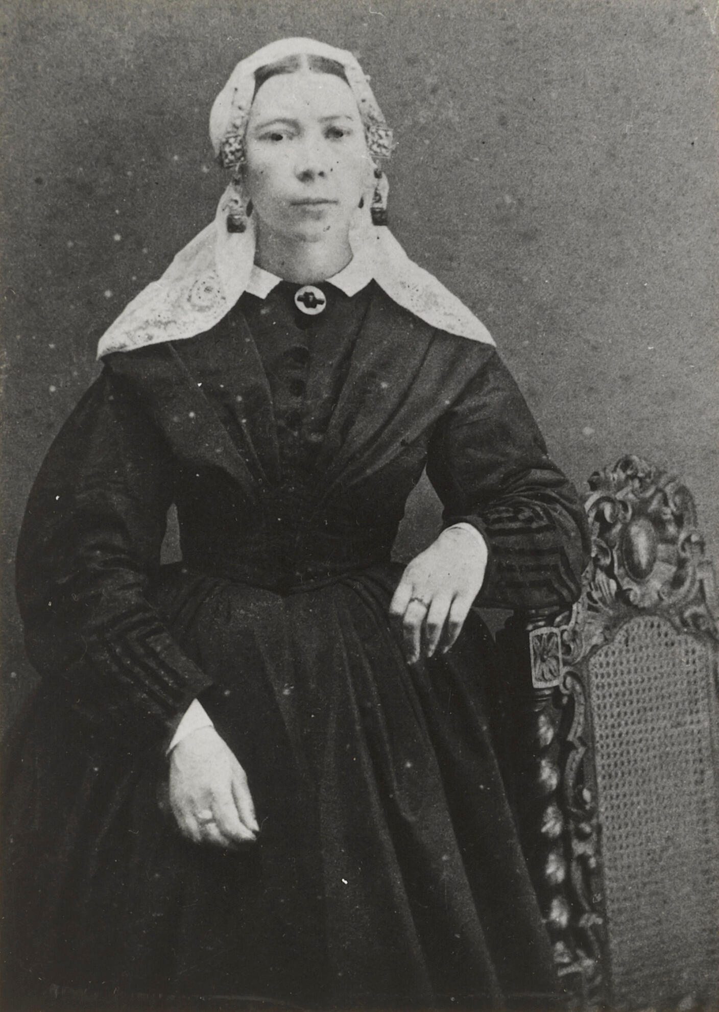 Redersvrouw in streekdracht uit Katwijk aan Zee. Ze is gekleed in een modejapon, in combinatie met de 'lange muts'. Onder de muts draagt ze een oorijzer met aan de uiteinden rechthoekige gouden 'boeken'. Achter de boeken zijn een paar gouden zijnaalden en een paar parelspelden in de muts gestoken. De boeken en zijnaalden zijn versierd ...