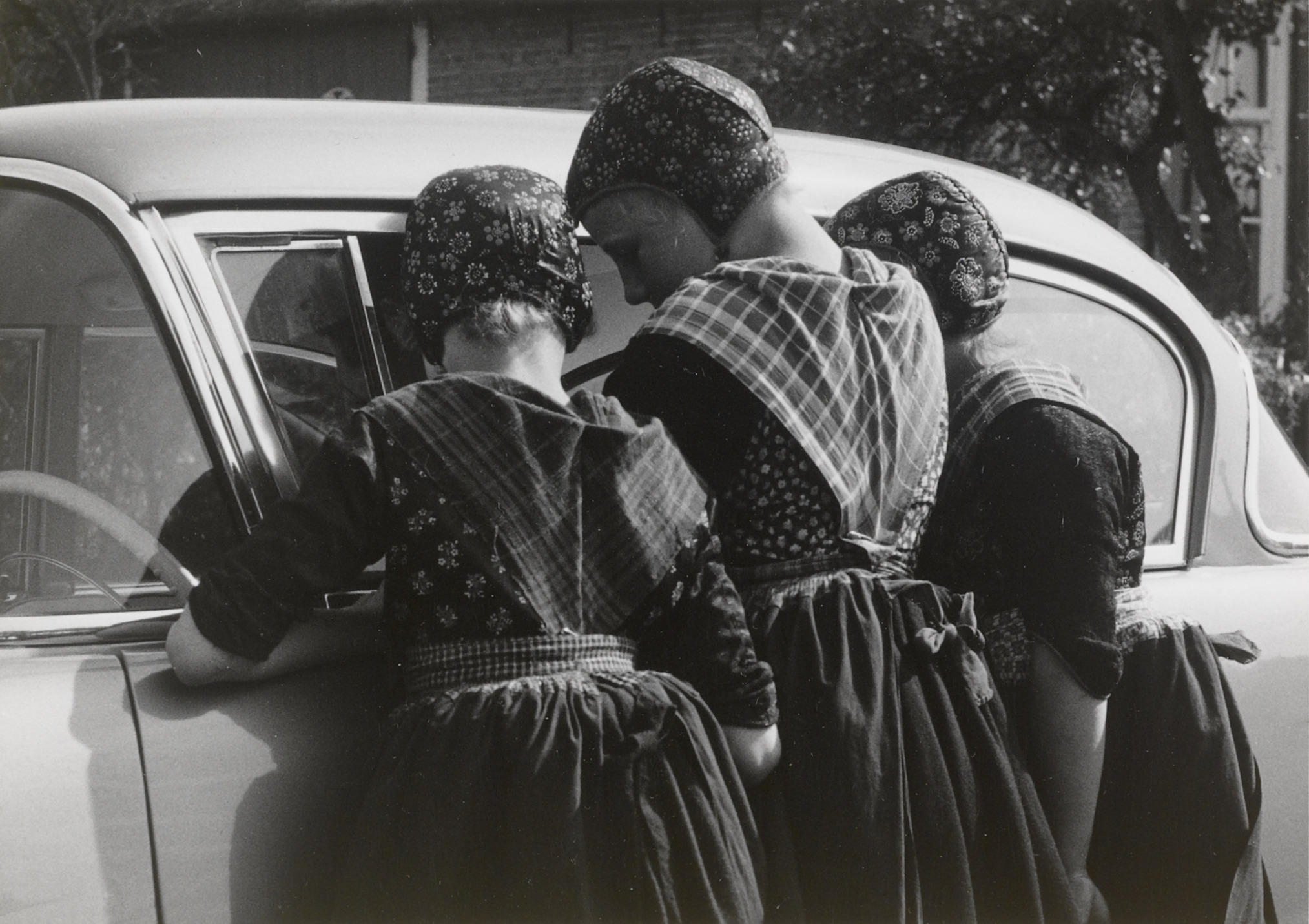 Drie meisjes in Staphorster streekdracht bij een auto. De meisjes zijn gekleed in daagse dracht. Het linker meisje, Beertje Timmerman, is in de rouw.