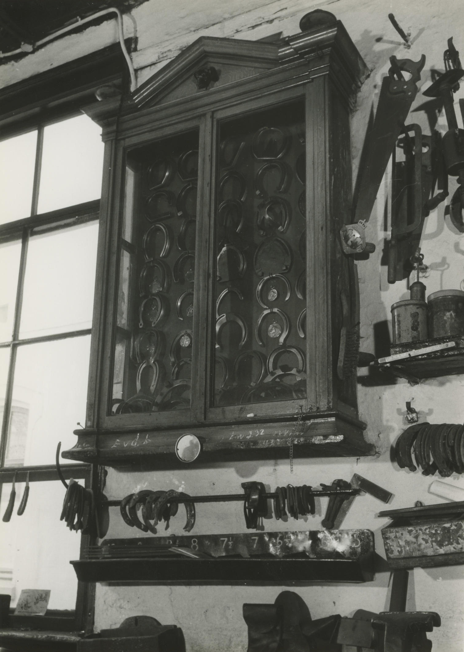 Modellenkastje met hoefijzers in het interieur van de hoefsmederij van Th. A. Poppe aan de Luttekestraat in Zwolle.