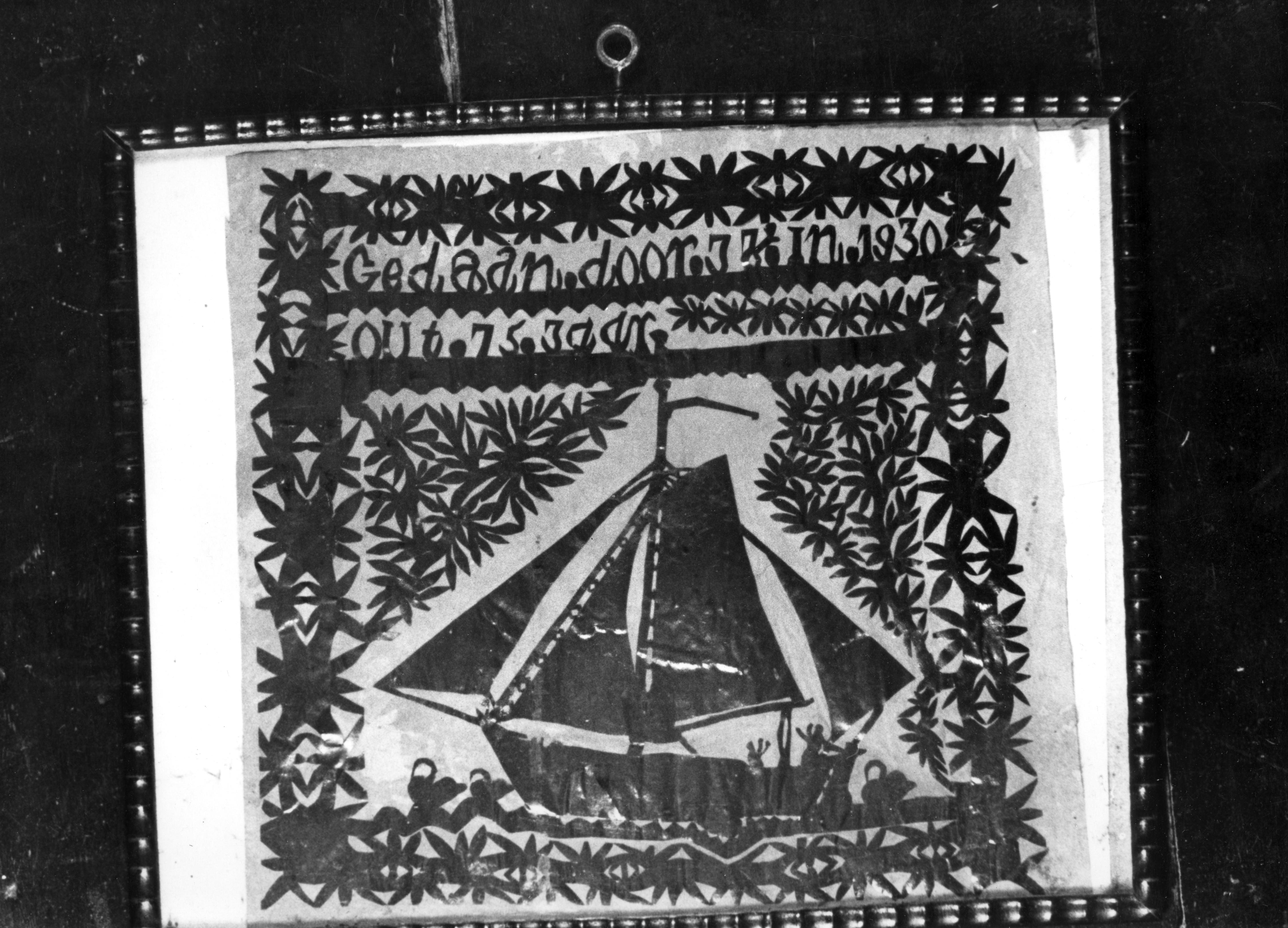 Ingelijste knipprent van een botter in een woning op Marken. De prent is in 1930 geknipt door 'Jan de prentenknipper' (Jan Visscher) van Urk.