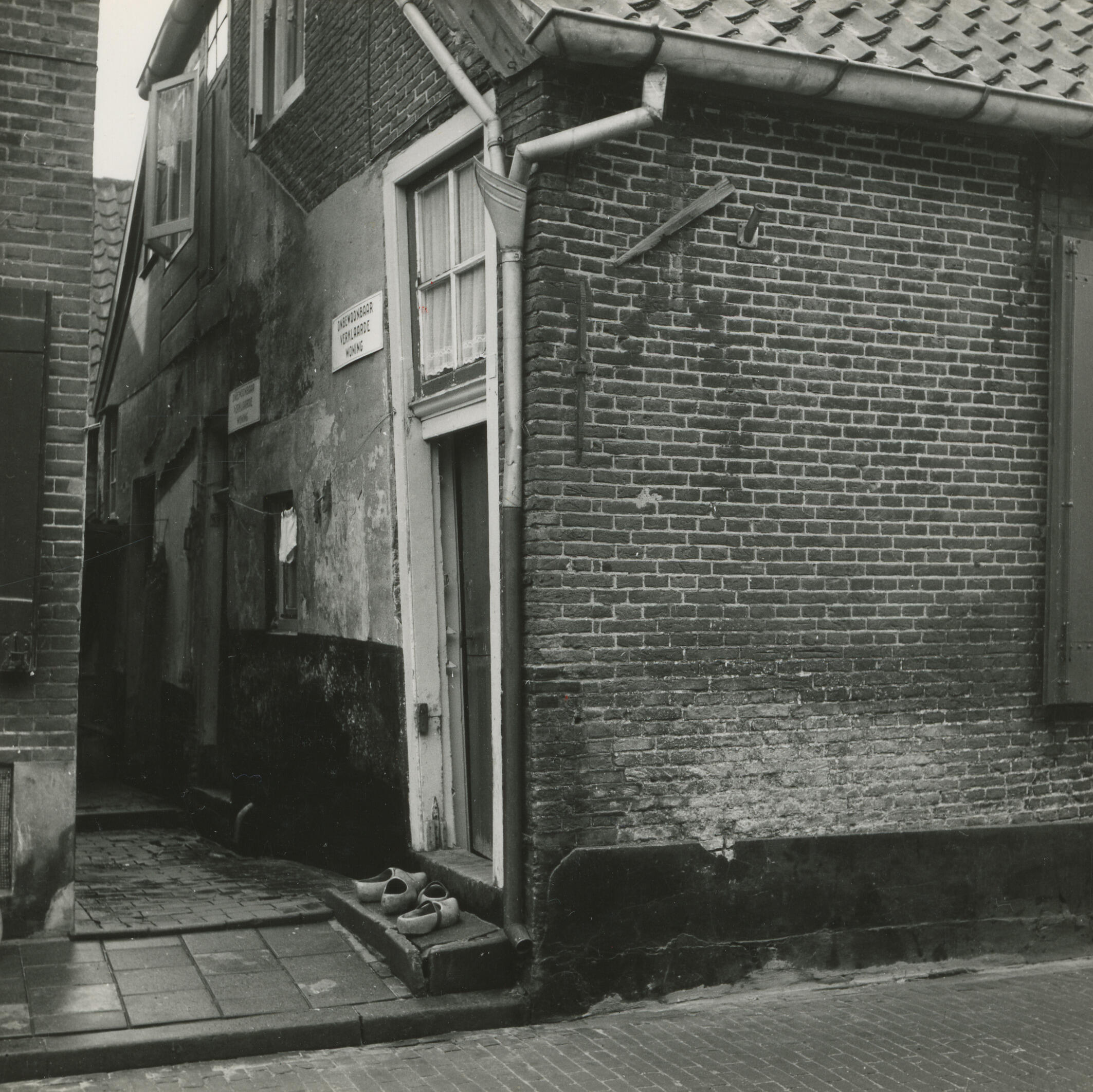 Een gedeelte van een woning in Spakenburg. Op de zijgevel zijn twee bordjes aangebracht met de tekst: 'onbewoonbaar verklaarde woning'. Op het stoepje voor de deur staan twee paar klompen.