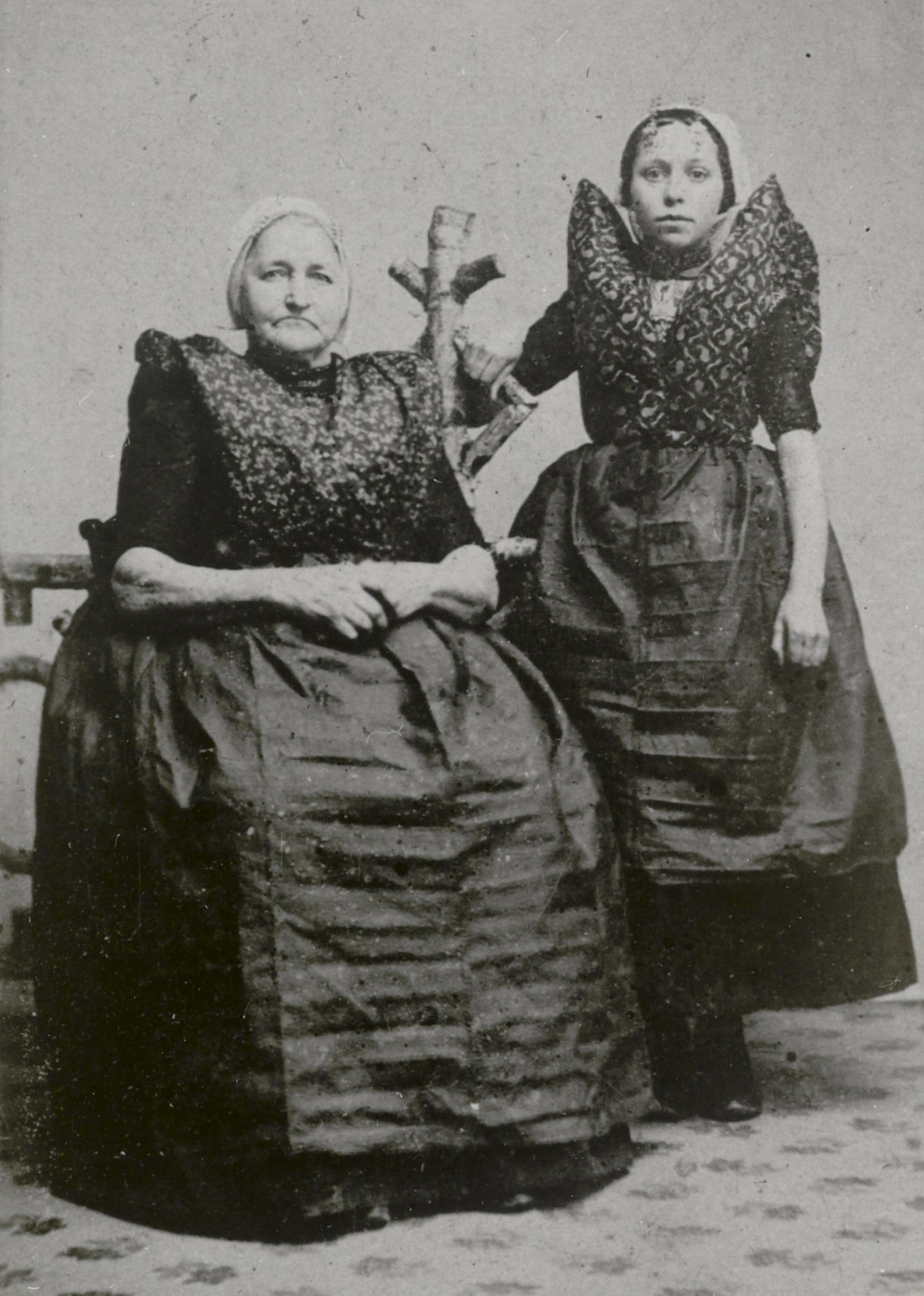 Streekdrachten zijn beslist geen oeroude kostuums die al eeuwen onveranderd zijn. Ze gaan met de mode mee, al is het soms op een eigenwijze manier. Per streek konden mode en het tijdstip van verandering verschillen. Deze foto van twee generaties vrouwen uit Axel, Zeeland, laat zien hoe de mode in streekdracht kon veranderen. Vooral aan ...