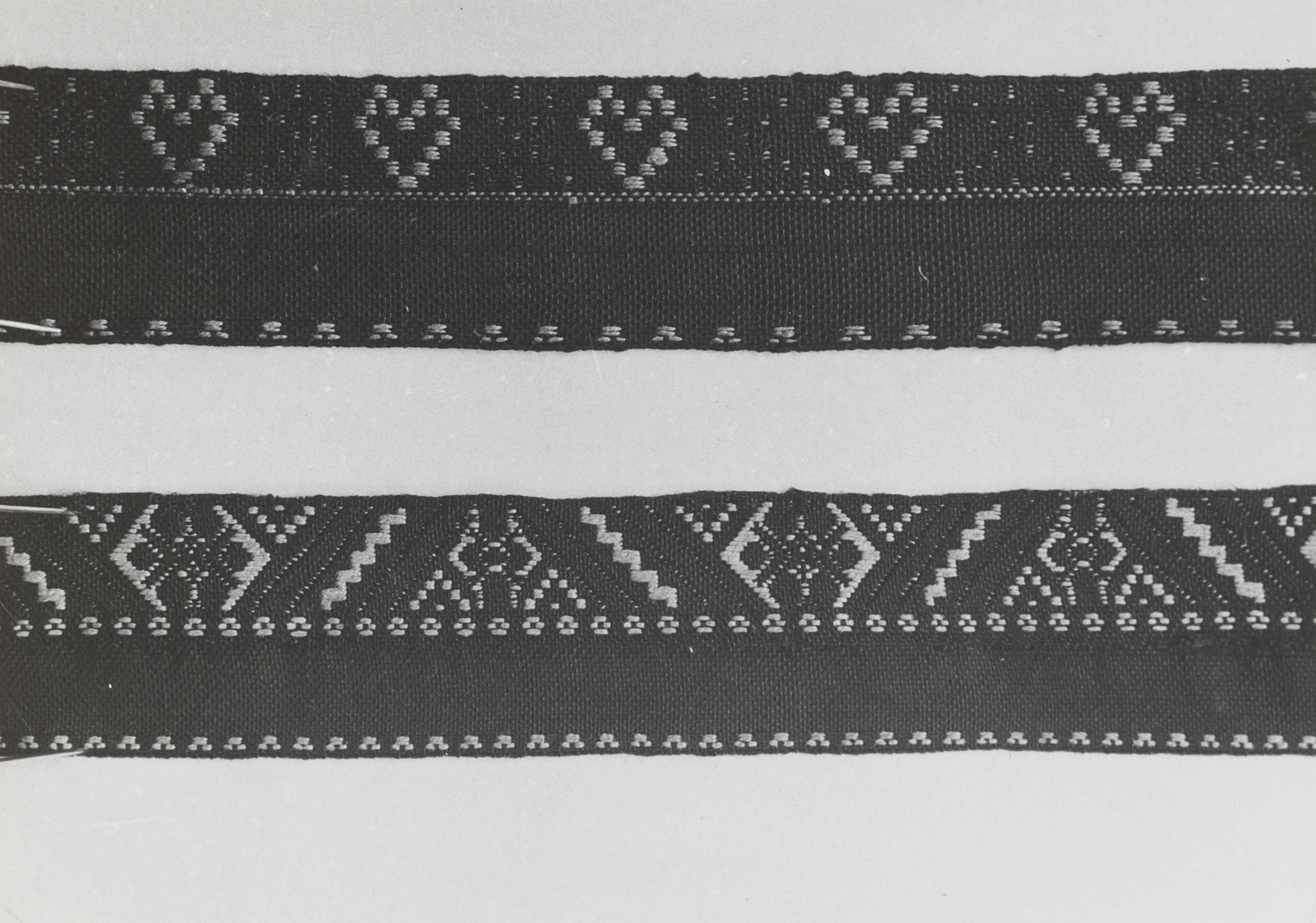 Twee stukken band met ingeweven zwart-wit dessins. Dit zijn zogenoemde trouwlintjes die door een Marker bruid in plaats van een 'vernaaid lint' onder de kap worden gedragen.