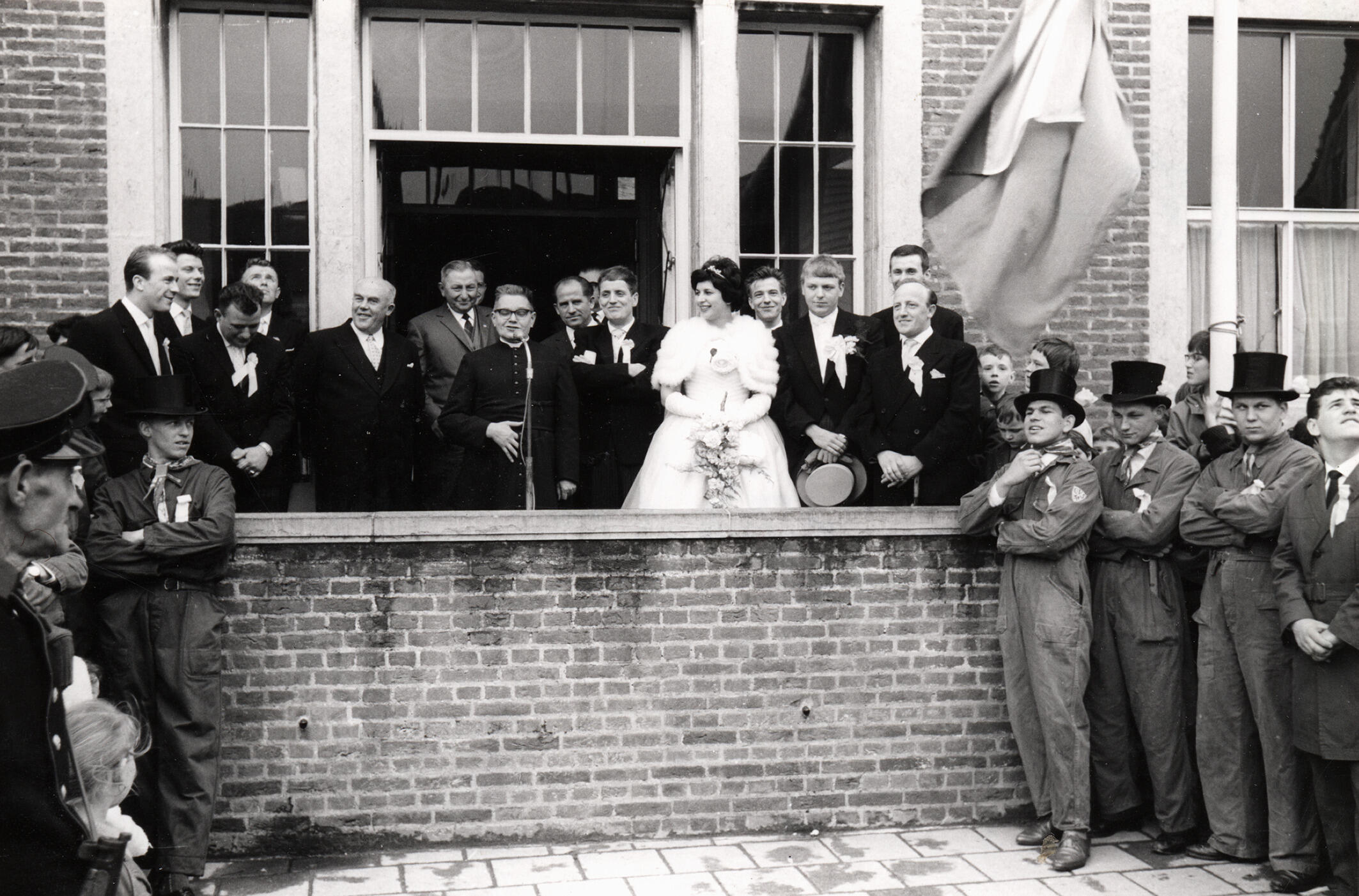 De Meikoningin op een bordes in Schinveld. Ze is omgeven door een groep mannen; voor de microfoon staat een geestelijke. Rechts op de voorgrond staan drie mannen met een hoge hoed. De koningin is in het wit gekleed, draagt een cape en een boeket bloemen. Boven haar wappert een vlag.