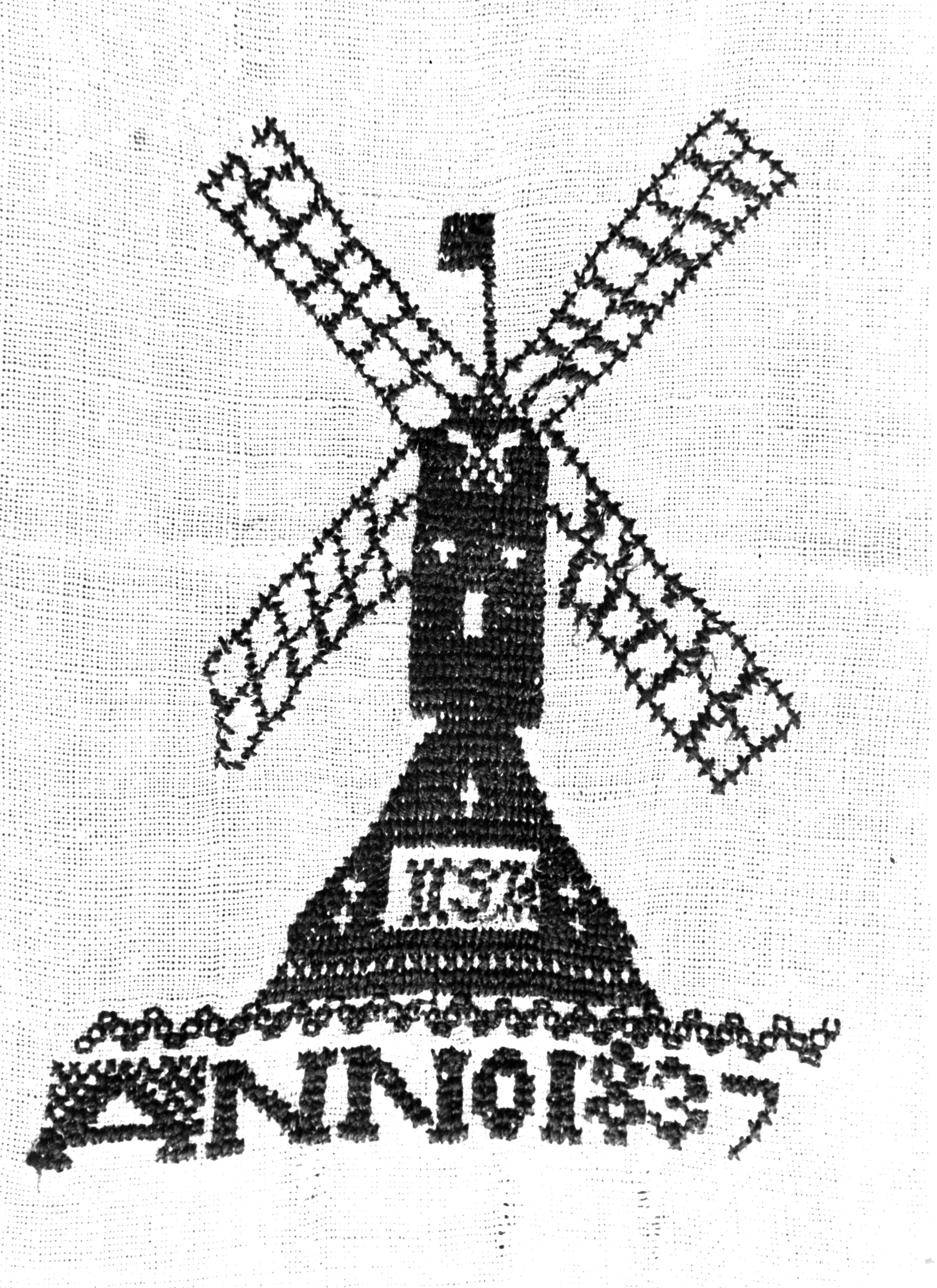 Detail van een zogenoemd spreitje van een pronkbedstede, versierd met kruissteekborduurwerk en de datering 1837. Het spreitje is eigendom van een vrouw op Marken.