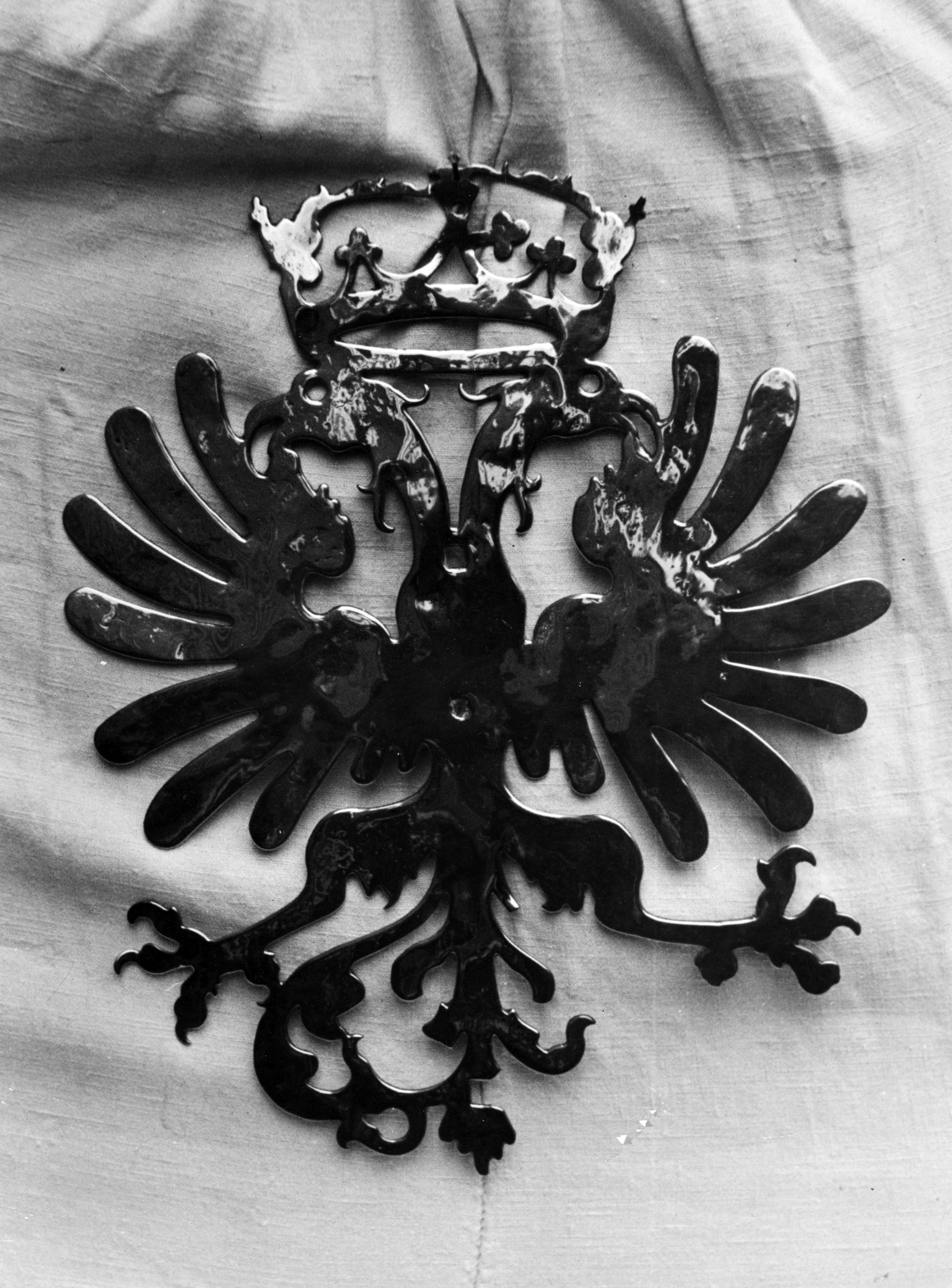 Gekroonde dubbele adelaar van koper, opgevist uit de Zuiderzee en gefotografeerd op Marken.