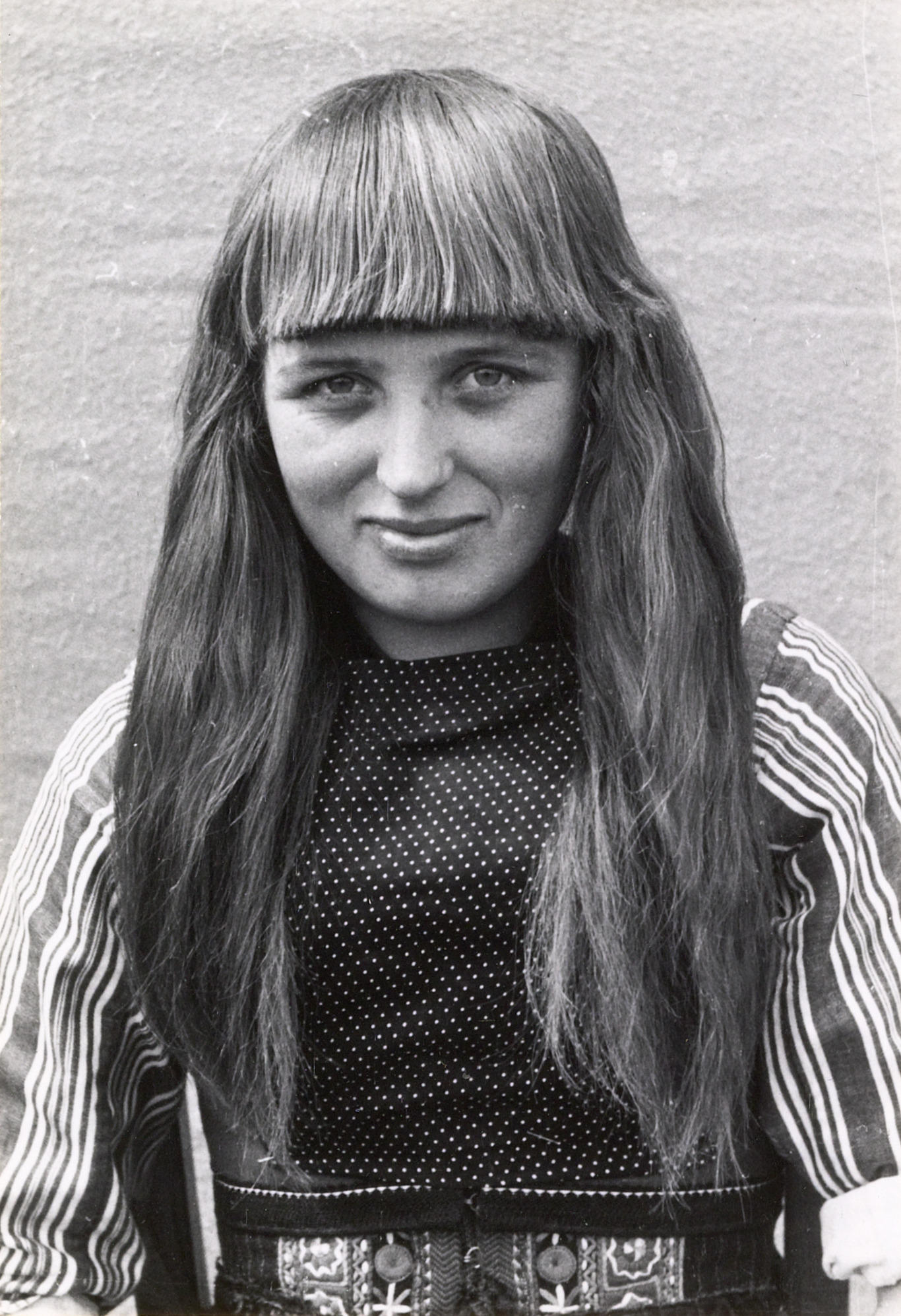 Demonstratie van het opzetten van de 'grote kap' door Luutje Stoker. Luutje heeft haar muts afgezet, waardoor de typische haardracht te zien is die bij de 'grote kap' gebruikelijk is. Het haar wordt verdeeld in twee pijpenkrullen en een pony. In de nek is het haar opgeschoren.