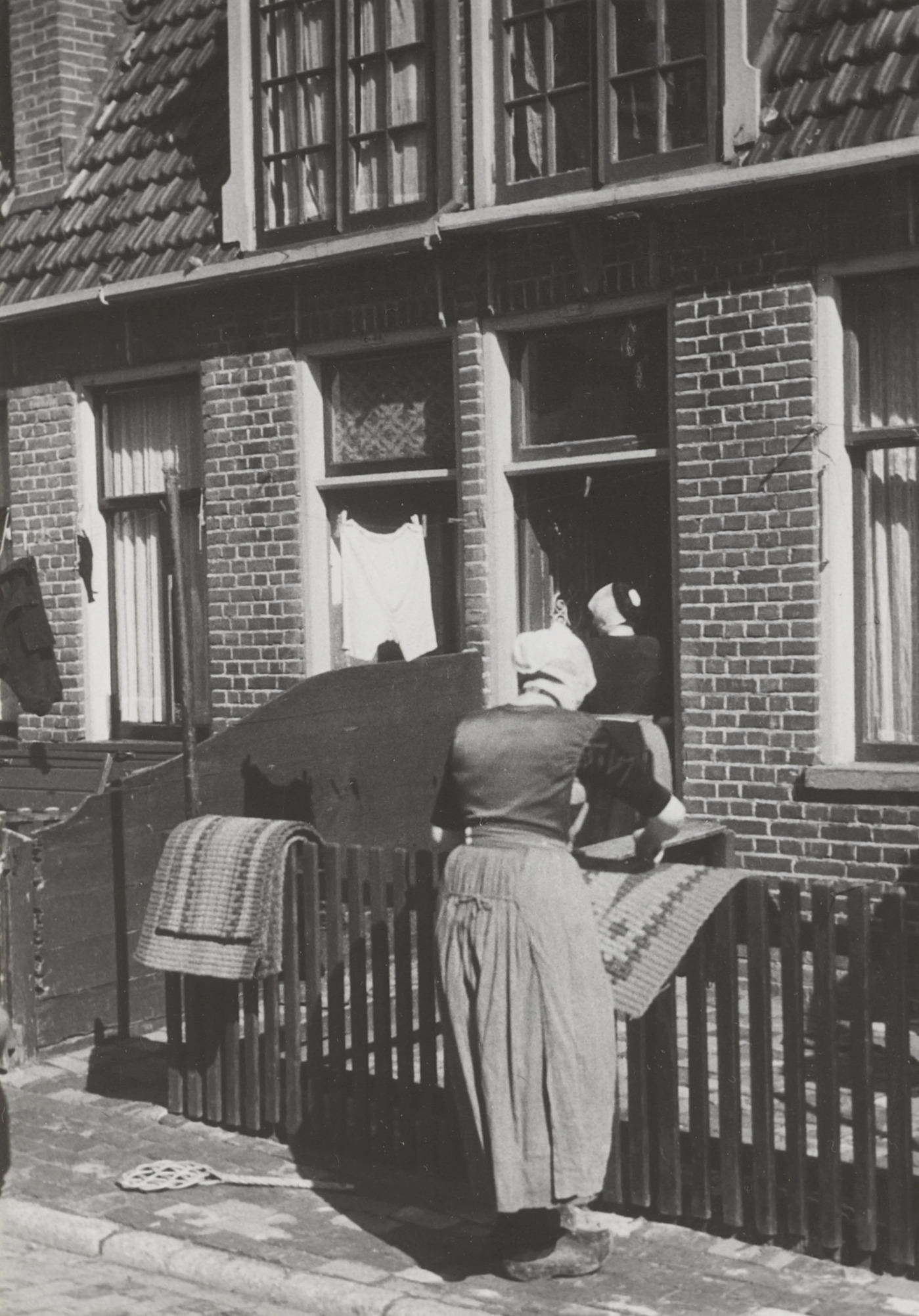 Twee vrouwen in Urker streekdracht, bezig met matten kloppen.