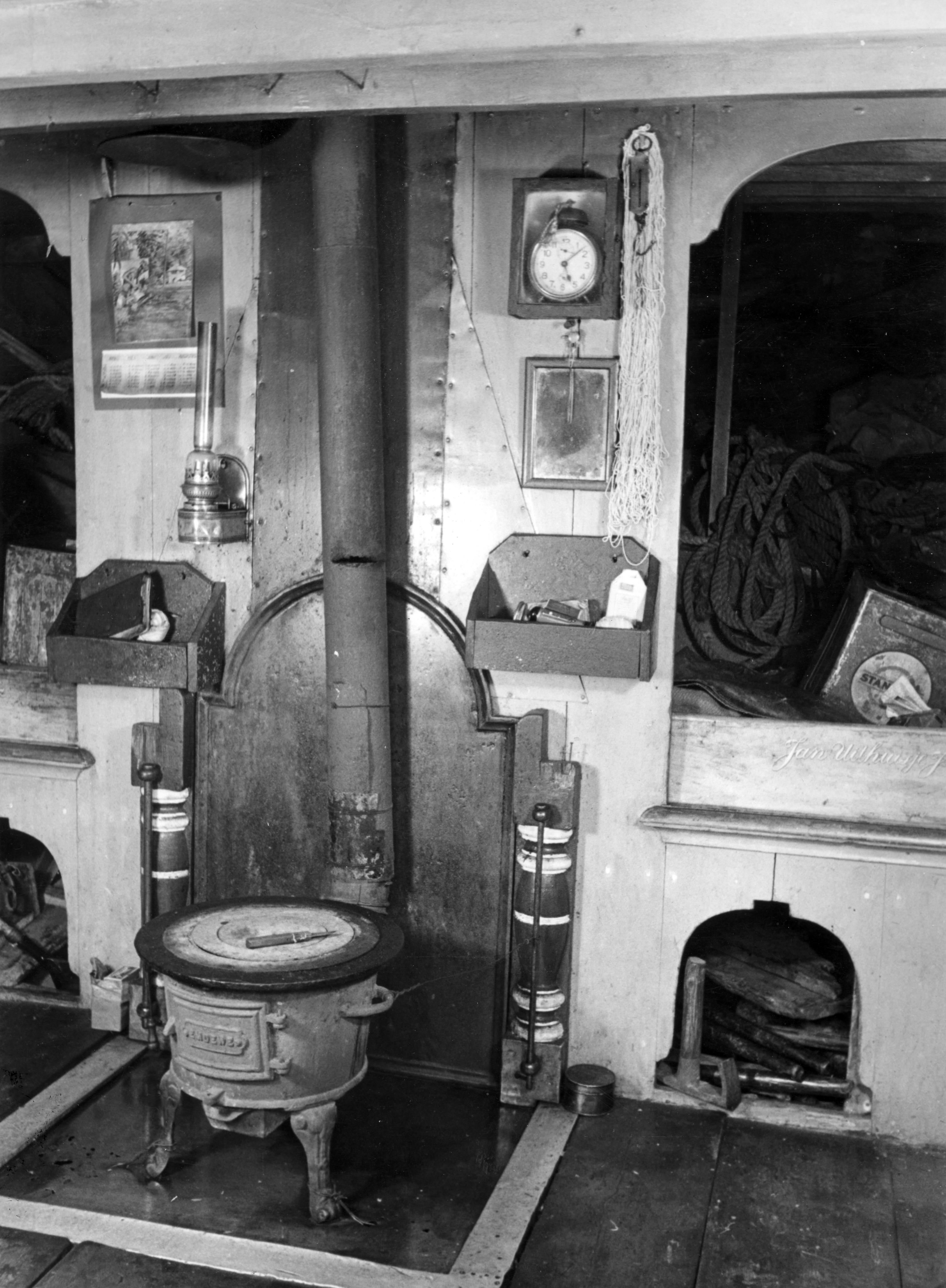 Kacheltje in het vooronder van de Marker botter MK 63, met links en rechts een bedstede.