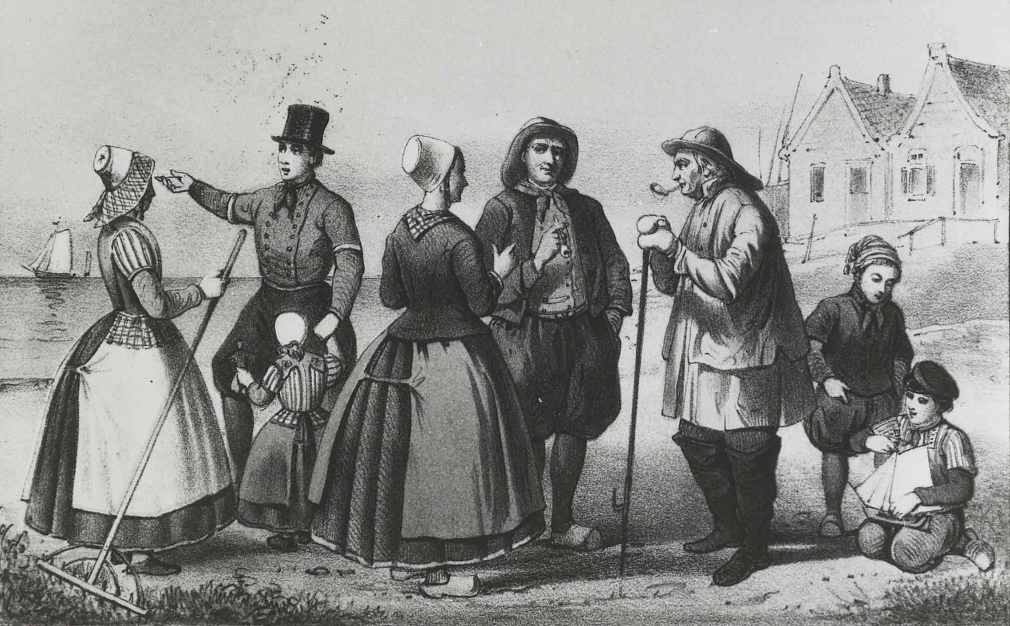 Tekening van streekdrachten op Marken uit 'Schetsen uit het Markensche volksleven' door Dr. S. Sr. Coronel in 1862. Van links naar rechts zijn afgebeeld: een vrouw in hooikostuum, een man in zomergewaad, een meisje jonger dan 14 jaar in zomerkleding, een vrouw in winterkleding, een man in winterkleding, een Marker in visserskleding, een jongen in ...