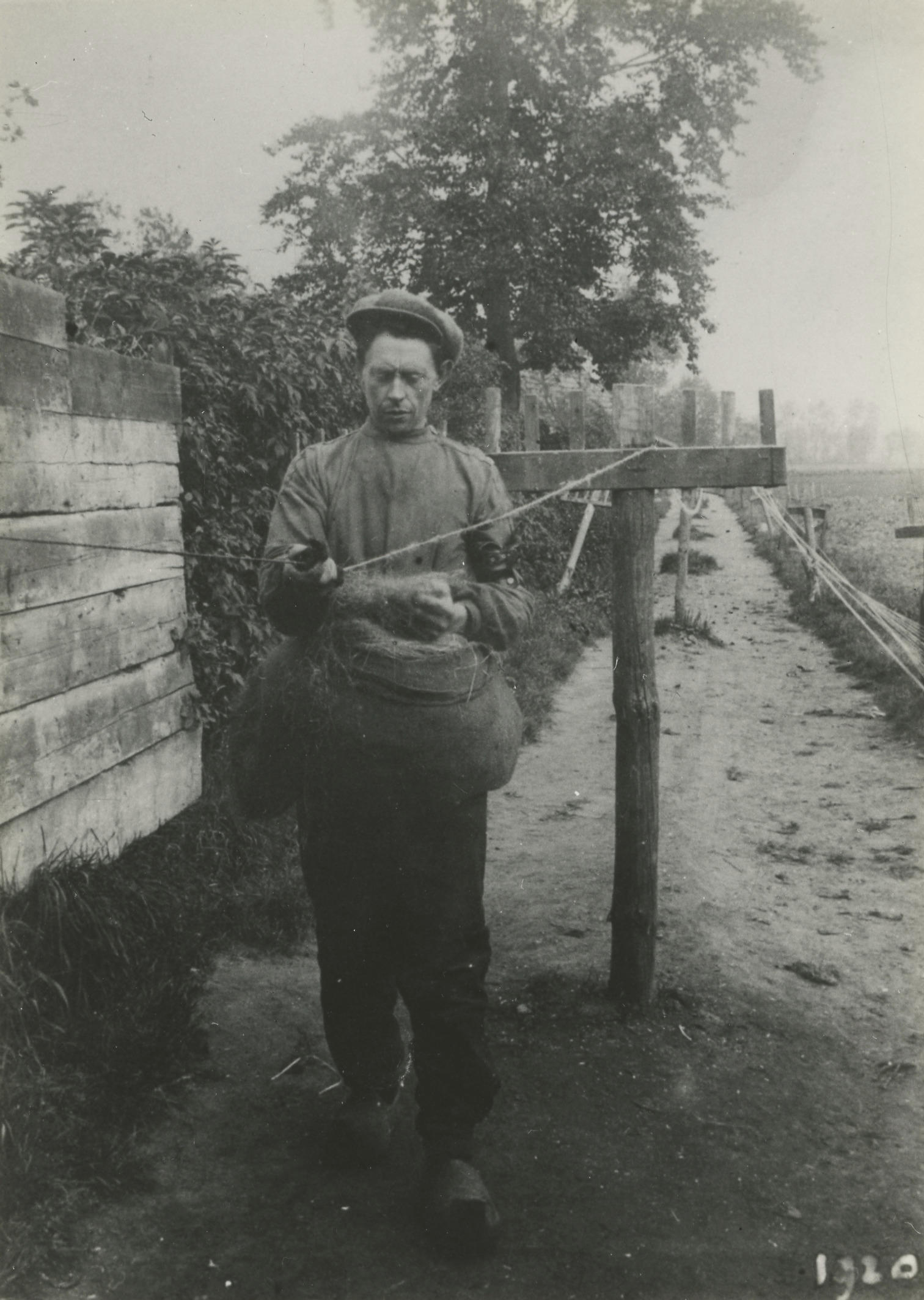 Man aan het werk op de touwslagerij van Ruger in Soest. Het gesponnen garen wordt gladgestreken met een spinlap. In een om het middel gebonden juten zak zit het te verspinnen materiaal, de ongesponnen hennep.