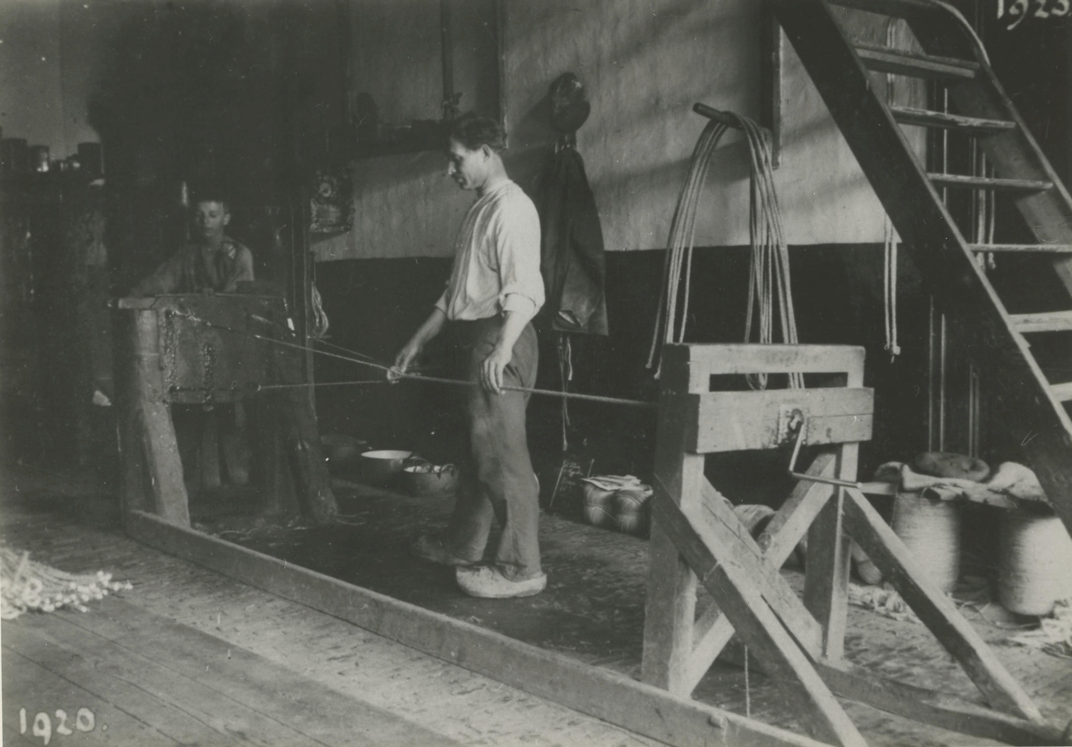 Het maken van korte touwen bij de touwslagerij van Ruger in Soest. Dergelijke korte, dikke touwen worden gebruikt als koetouwen. De leerjongen (links) draait de zogenoemde wapper. Ruger (rechts) hanteert de 'tol'. De tol is voorzien van een steel. Rechts op de voorgrond staat de slee. Tijdens het twijnen, waardoor de drie strengen steeds korter ...
