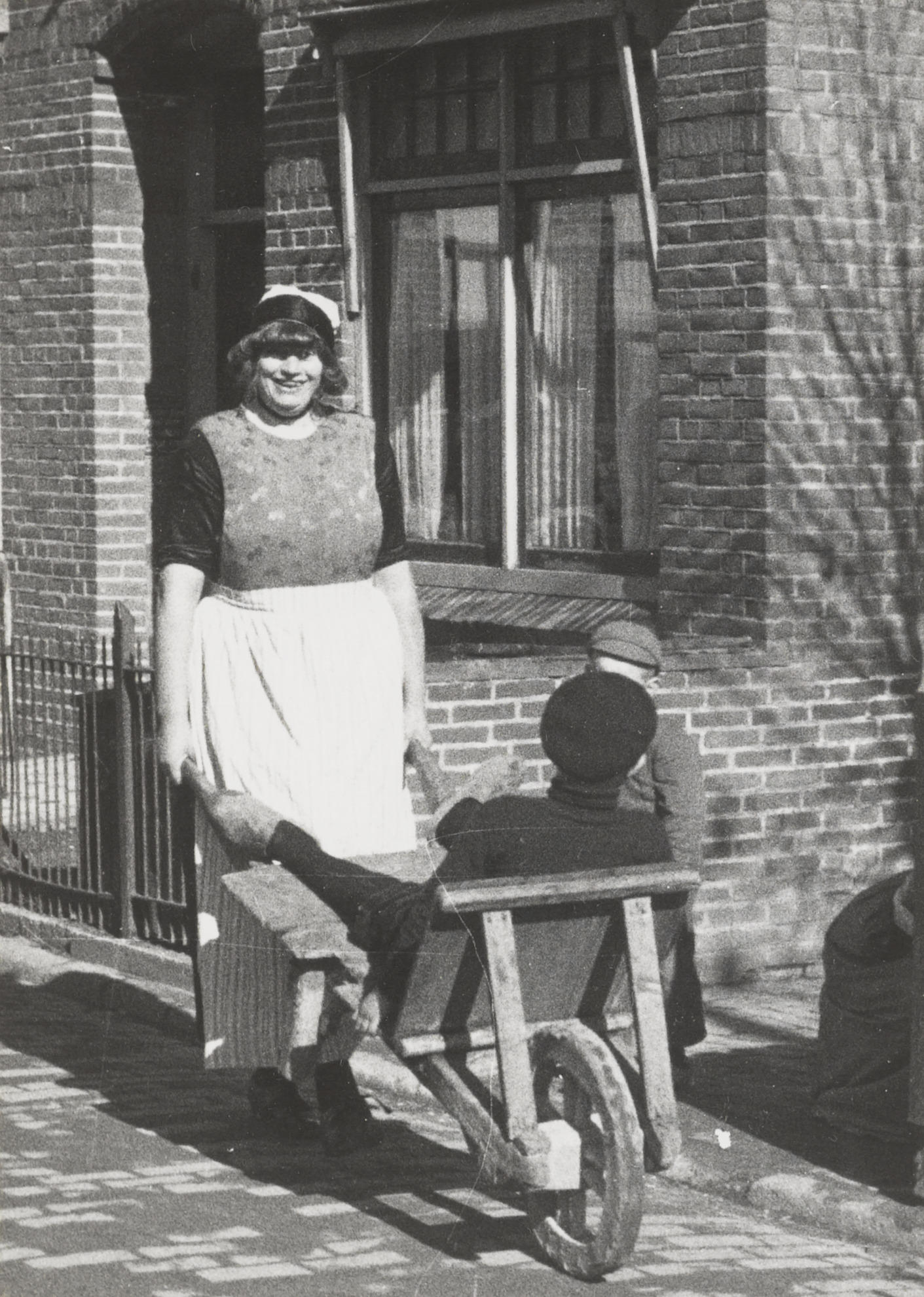 Vrouw in Urker dracht met man op kruiwagen, 1942 (zwart-wit foto)