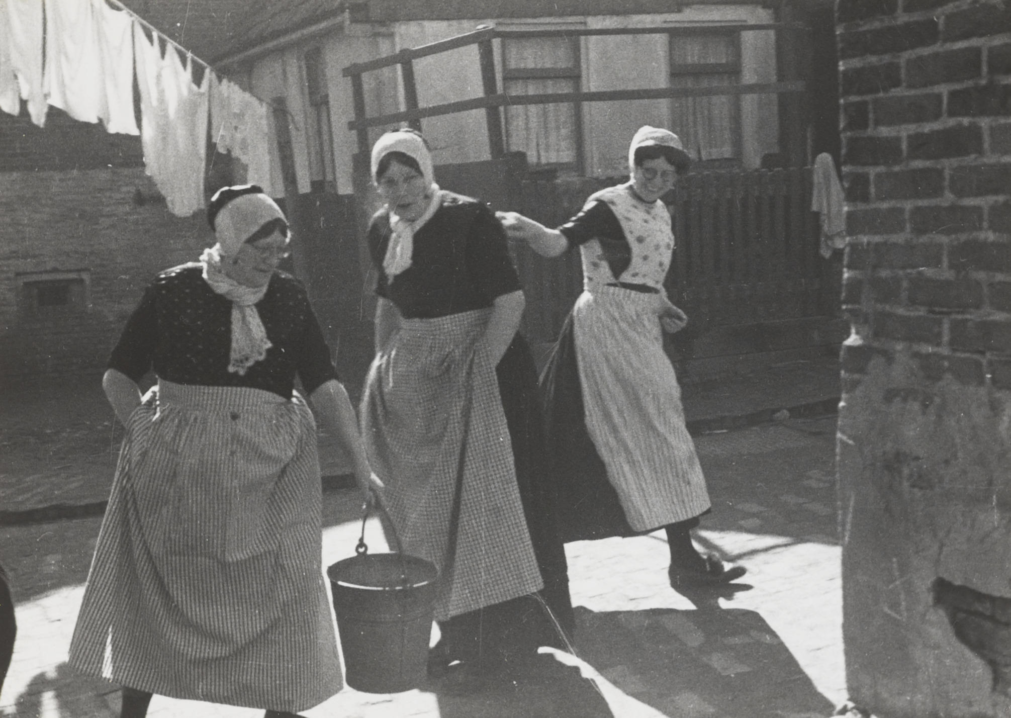 Drie vrouwen in Urker dracht, 1942 (zwart-wit foto)